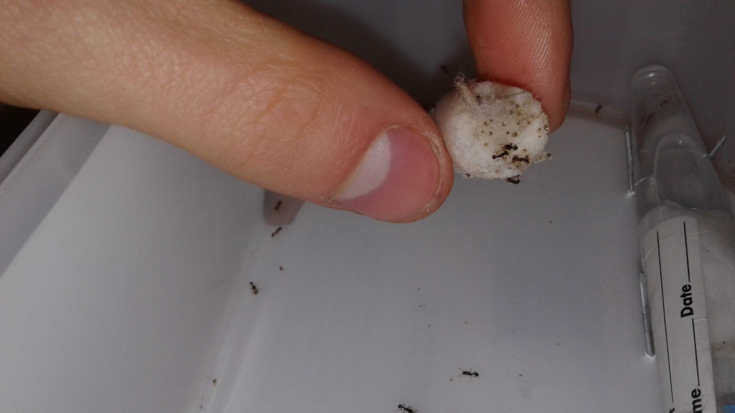 - Dopo aver letto il tuo messaggio ho aggiunto del pan grattato in arena in modo che arrivasse alla cannuccia, alle formiche è piaciuto e lo hanno utilizzato per costruirsi un'entrata a loro piacimento, alla fine lo hanno pure "Legato" con fili di cotone presi dalla provetta in modo che divetasse quasi solido.