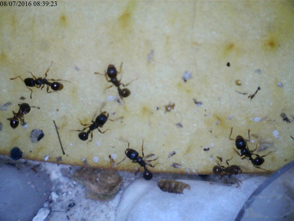 Visto questo, credo che le Tetramorium siano una delle formiche migliori con cui iniziare, vista sia la loro prolificità sia la loro resistenza. La colonia Alpha, come si poteva vedere in qualche foto dell'anno scorso, ha all'interno del formicaio qualche larva di Plodia interpunctella.