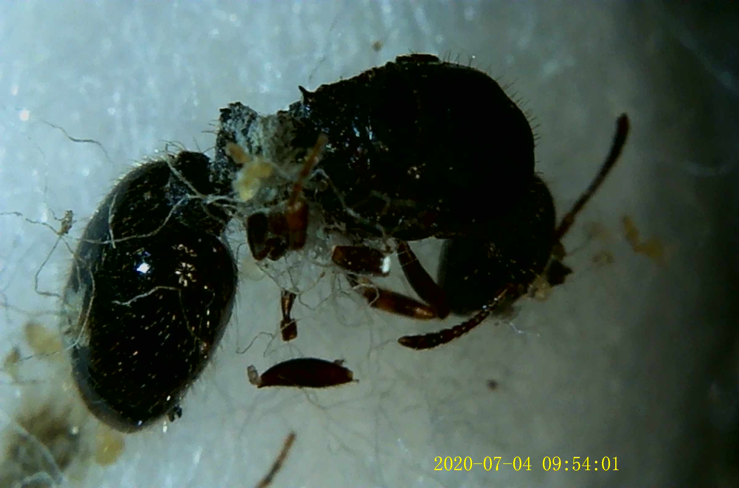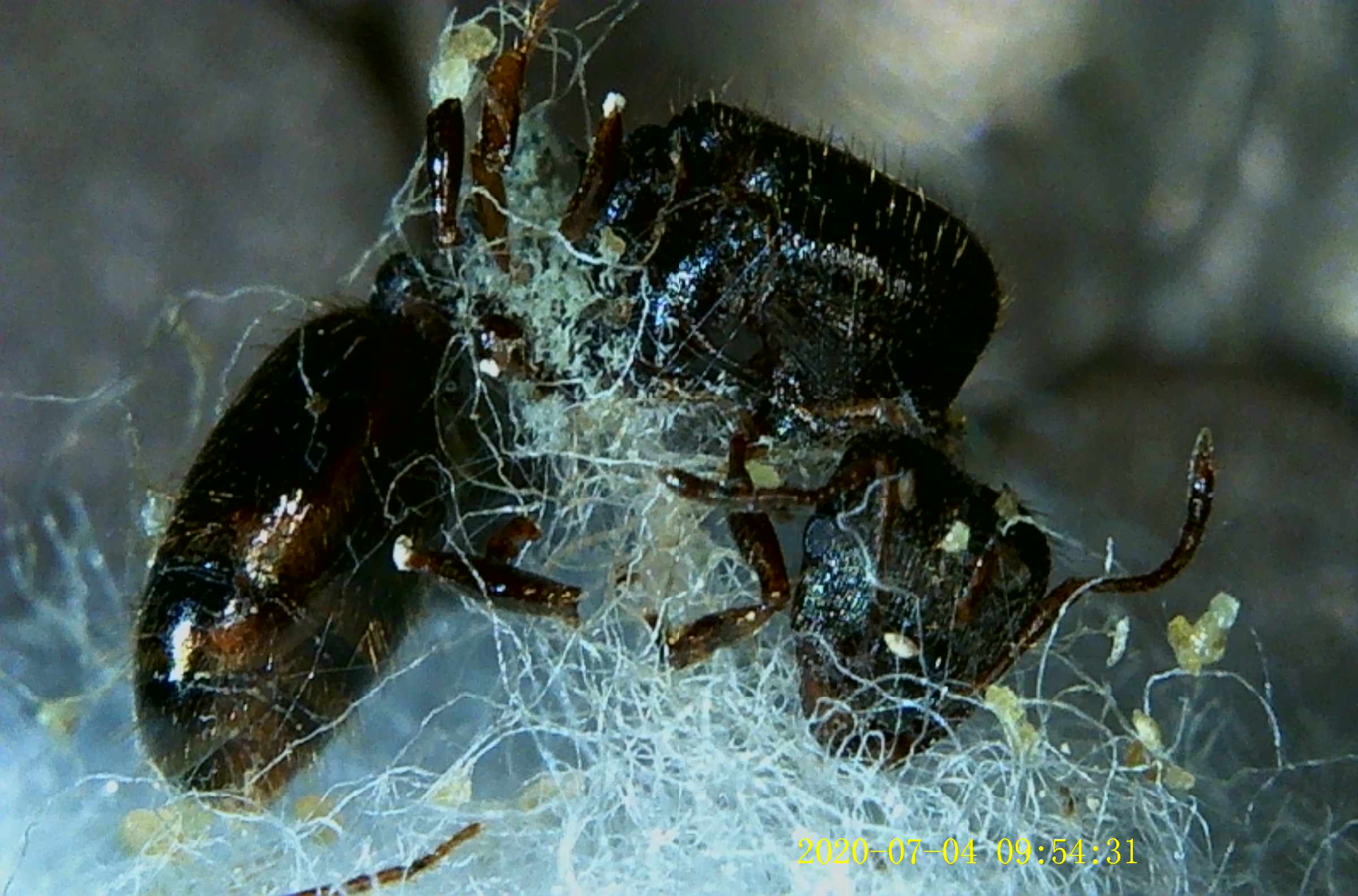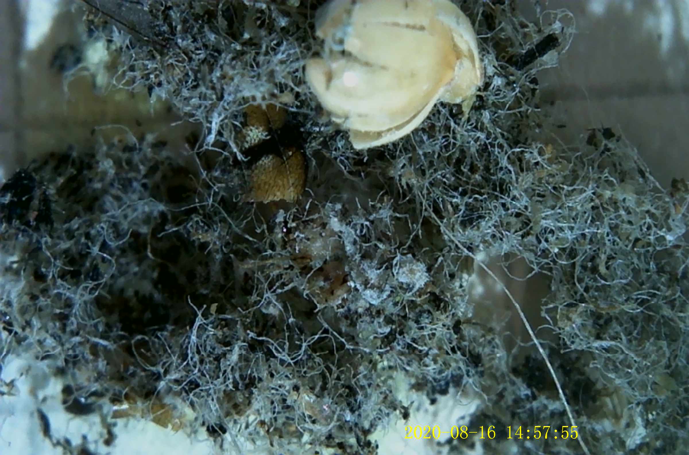 Sono diventate molto intrepide e il serbatoio d'acqua è vuoto, ciò mi ha costretto ad aprire la provetta in una arena per effettuare un cambio. Quando ancora erano in provetta, notavo che costruivano una specie di ammasso di filamenti nerastri con i rifiuti, che prontamente rimuovevo; immagino sia il cotone del serbatoio (nero per la presenza della muffa) impastato con rifiuti vari.