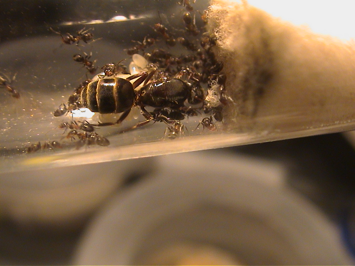 Tutto sommato procede bene, ma c'è una cosa che non mi convince. Nonostante io fornisca miele e piccoli insetti (moscerini, zanzare e farfalline) che vengono consumati regolarmente dalle operaie, la regina continua ad avere il gastro ristretto. Spero che la situazione migliori con il passare dei giorni.
