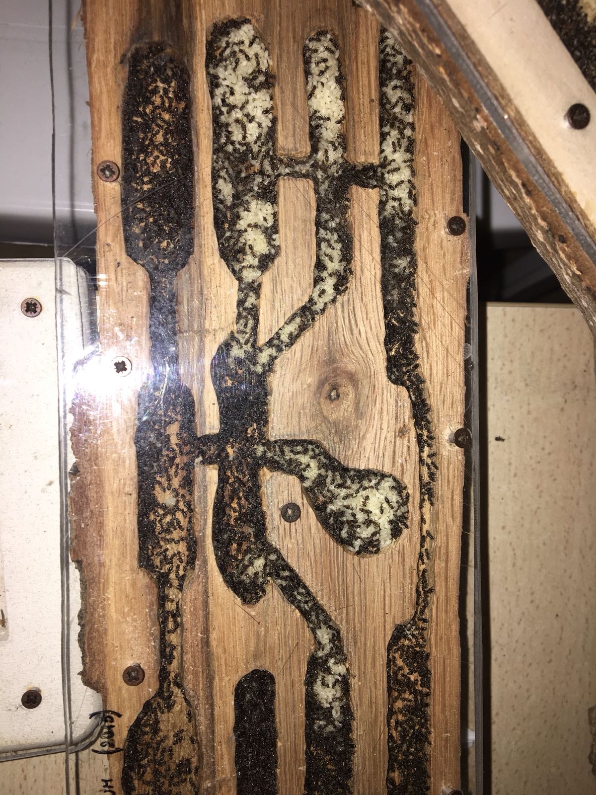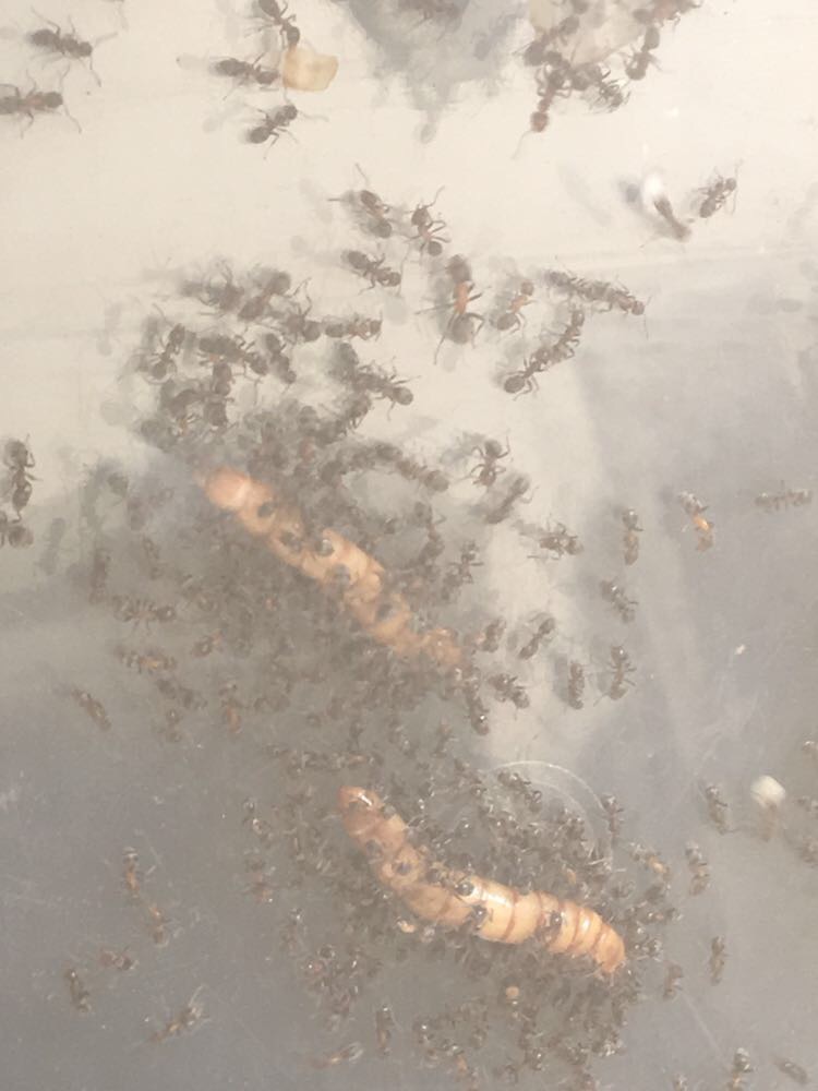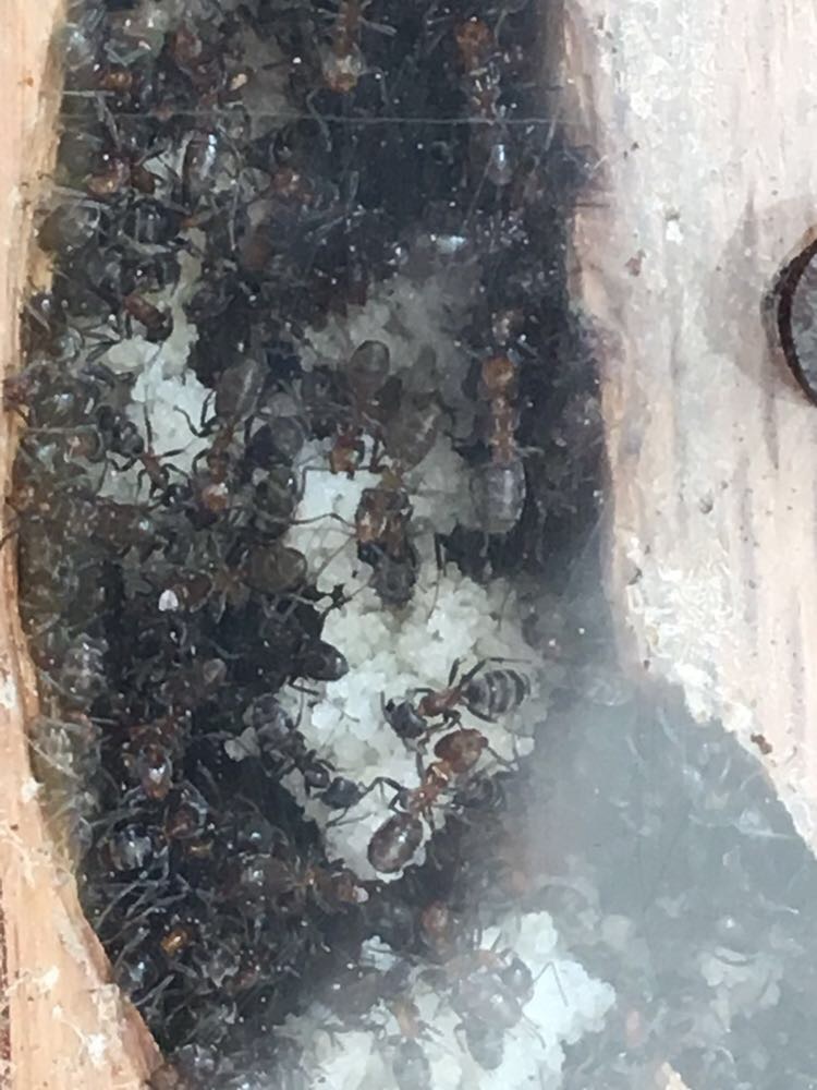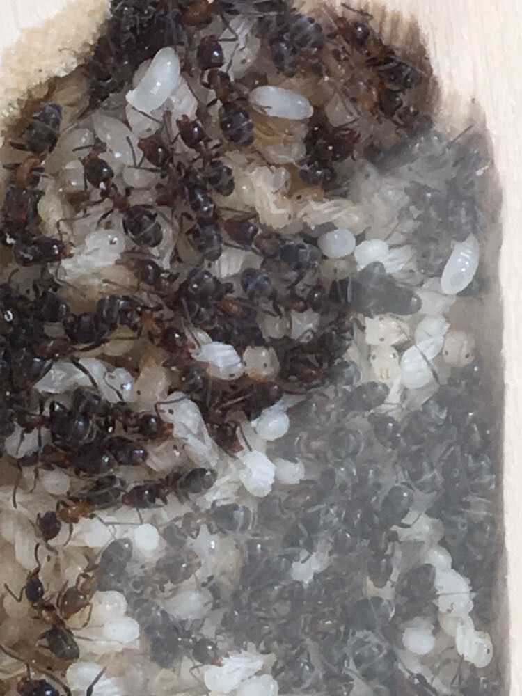 Oggi, 5 marzo 2018 la colonia ha un buon numero di larve e molte uova, nonché la regina si presenta con un gastro abbastanza espanso e quindi, molto probabilmente, quest'estate dovrò aggiungere un altro formicaio in legno. In questo momento sto aumentando sia la quantità di proteine sia quella di carboidrati. Ho inserito anche, tra un nido e l'altro, un tappetino riscaldante che accendo solo nelle ore centrali del giorno, in quanto molte operaie avevano creato glomeri per riscaldarsi in arena, lasciando il nido troppo vuoto.