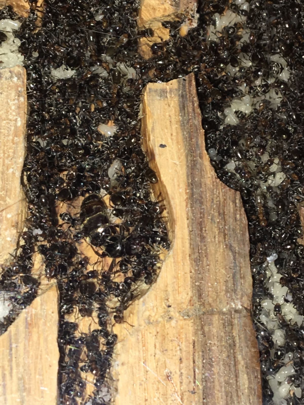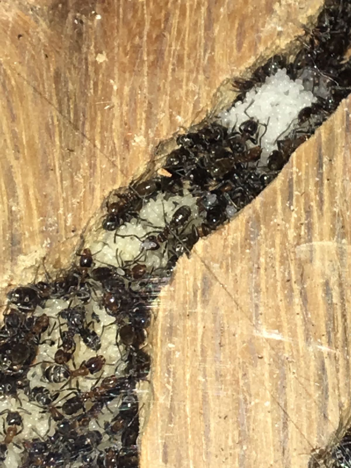 Dal momento che tra notte e giorno c'era un discreto sbalzo termico tutte le altre specie hanno iniziato a bloccarsi, sia con le deposizioni sia con l'accrescimento delle larve, mentre, la Liometopum microcephalum, come di natura, ancora deponeva in quantità. Visto che di notte le temperature si abbassavano fino a 7-8 gradi, tutte le operaie portavano la massiccia covata (pupe e larve all'ultimo stadio) nel formicaio in quercia, cosicché fosse più riparato dal freddo della notte (si trova sotto quello in pioppo) e poi con l'aumento delle temperature le riportavano tutte in superficie essendo più caldo.