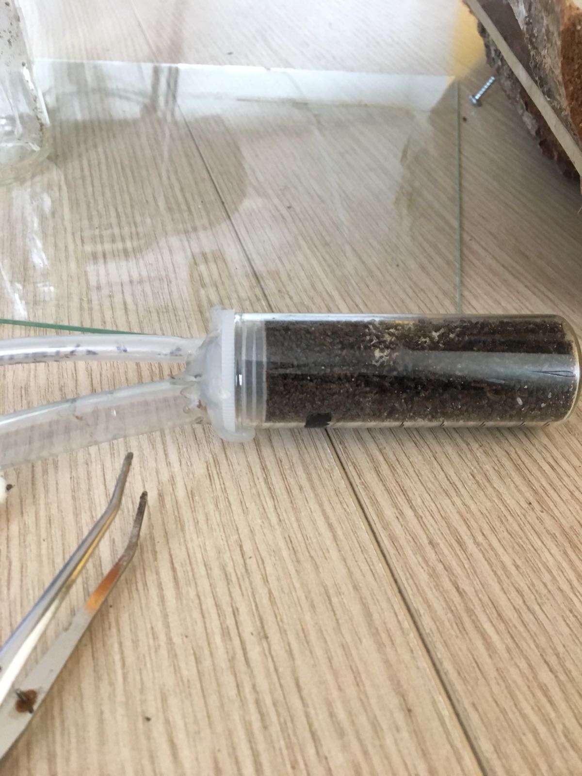 Per arginare questo problema, ho creato una mini aspirapolvere; essa è costruita da un barattolino avente il tappo con due buchi da cui partono due tubi, uno è “chiuso” con del tessuto non tessuto (nell’estremità che va dentro il contenitore) e l’altro è libero. Quello chiuso va collegato direttamente nell’aspirapolvere, per cui l’altro raccoglie le formiche che si spargerebbero dappertutto. In linea di massima si arriva a raccogliere un barattolino pieno di operaie.