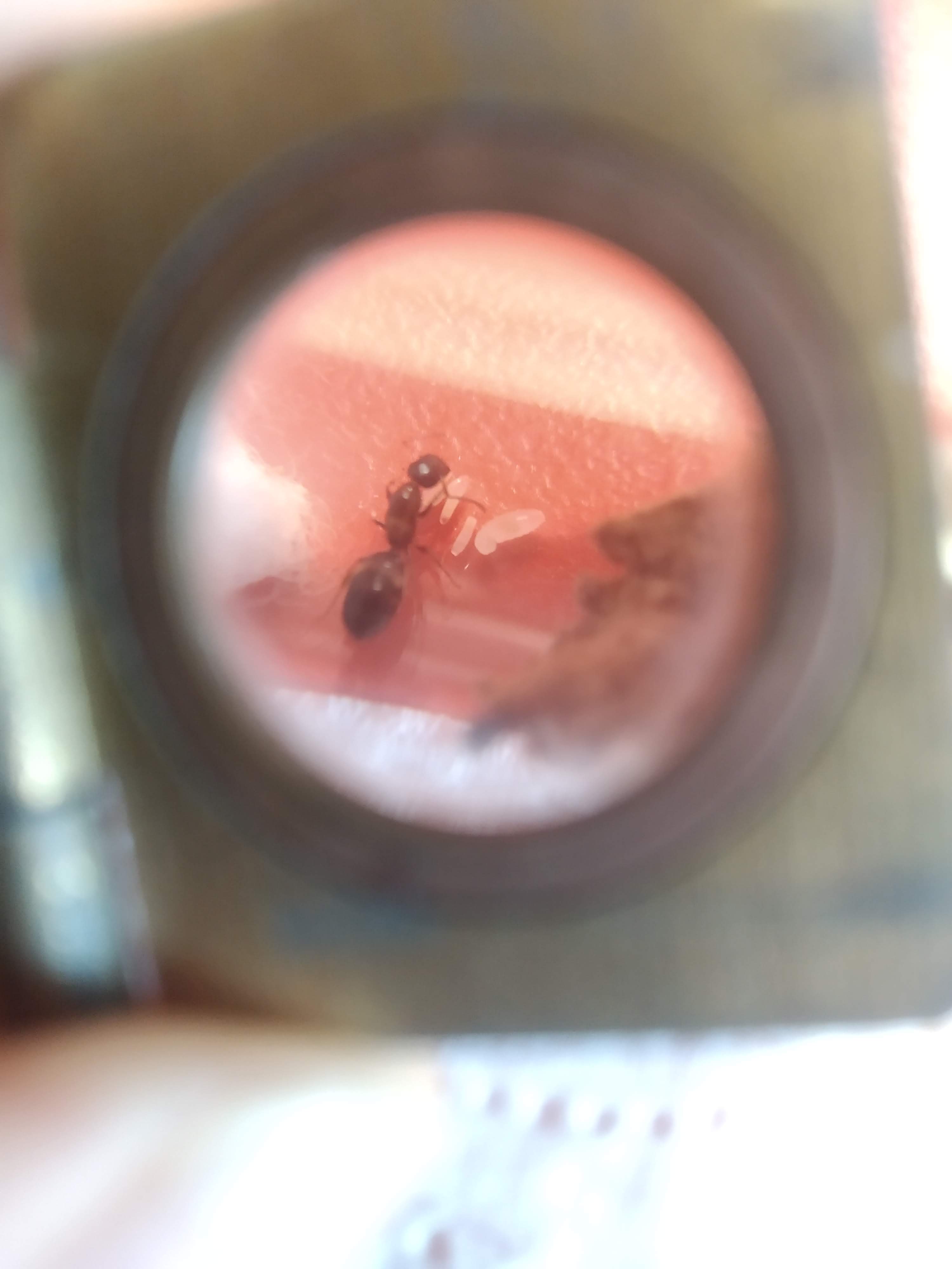 Nella colonia Beta è sfarfallata la seconda operaia. Da quello che ho potuto osservare, adesso, la regina ha smesso di seguire la covata come faceva in precedenza, stava sempre vicino ad essa, mentre adesso è rintanata nel pezzetto di sughero e sono le due operaie a seguire la future generazioni.