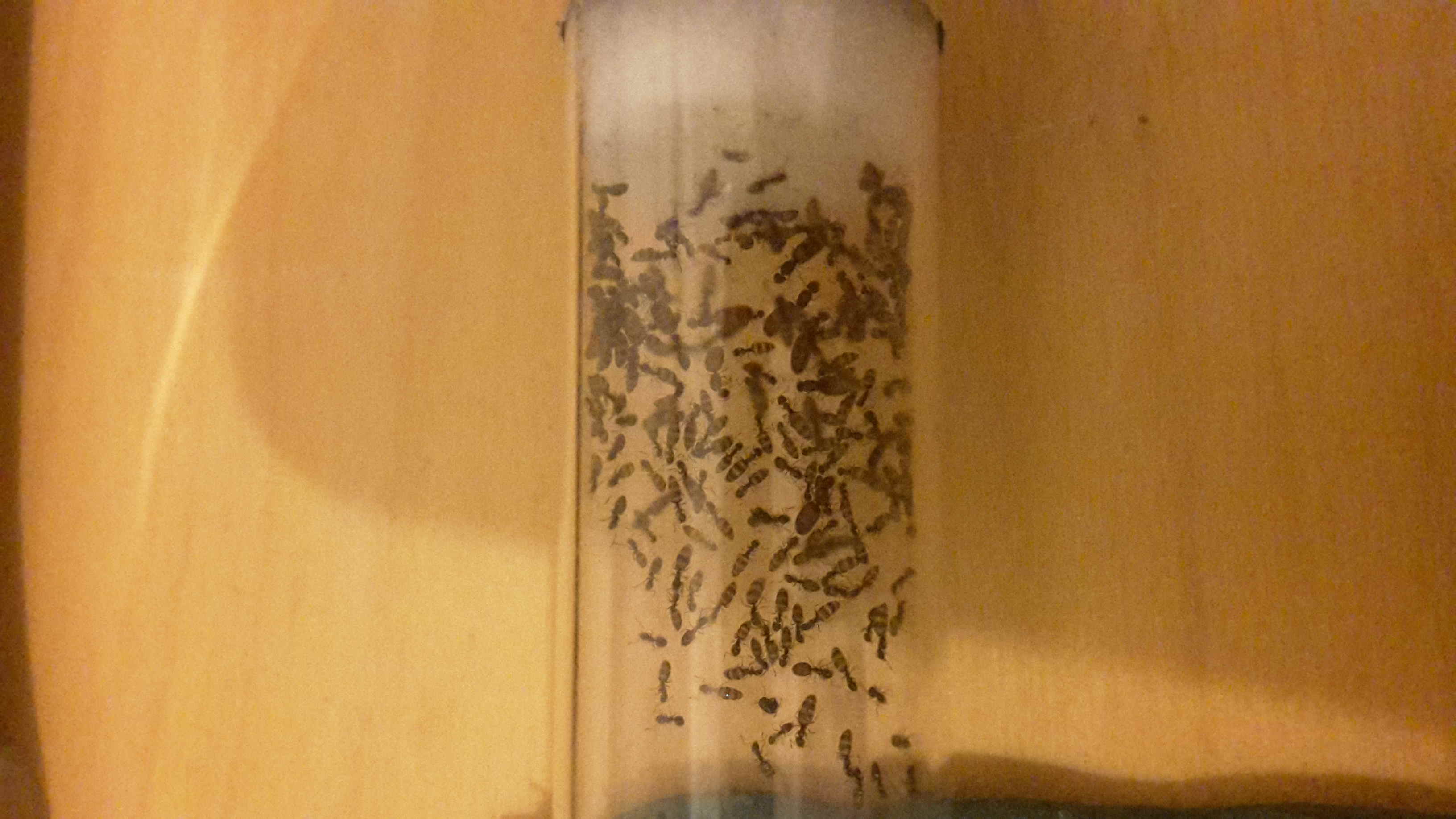Qualche giorno dopo ho controllato la provetta in arena rimuovendo lo strato oscurante e ho scoperto che la regina ribelle se ne era impossessata, le operaie intorno a lei erano notevolmente aumentate ed erano presenti larve e uova (che non so da dove vengono perché non sembrava ce ne fossero ancora in arena).