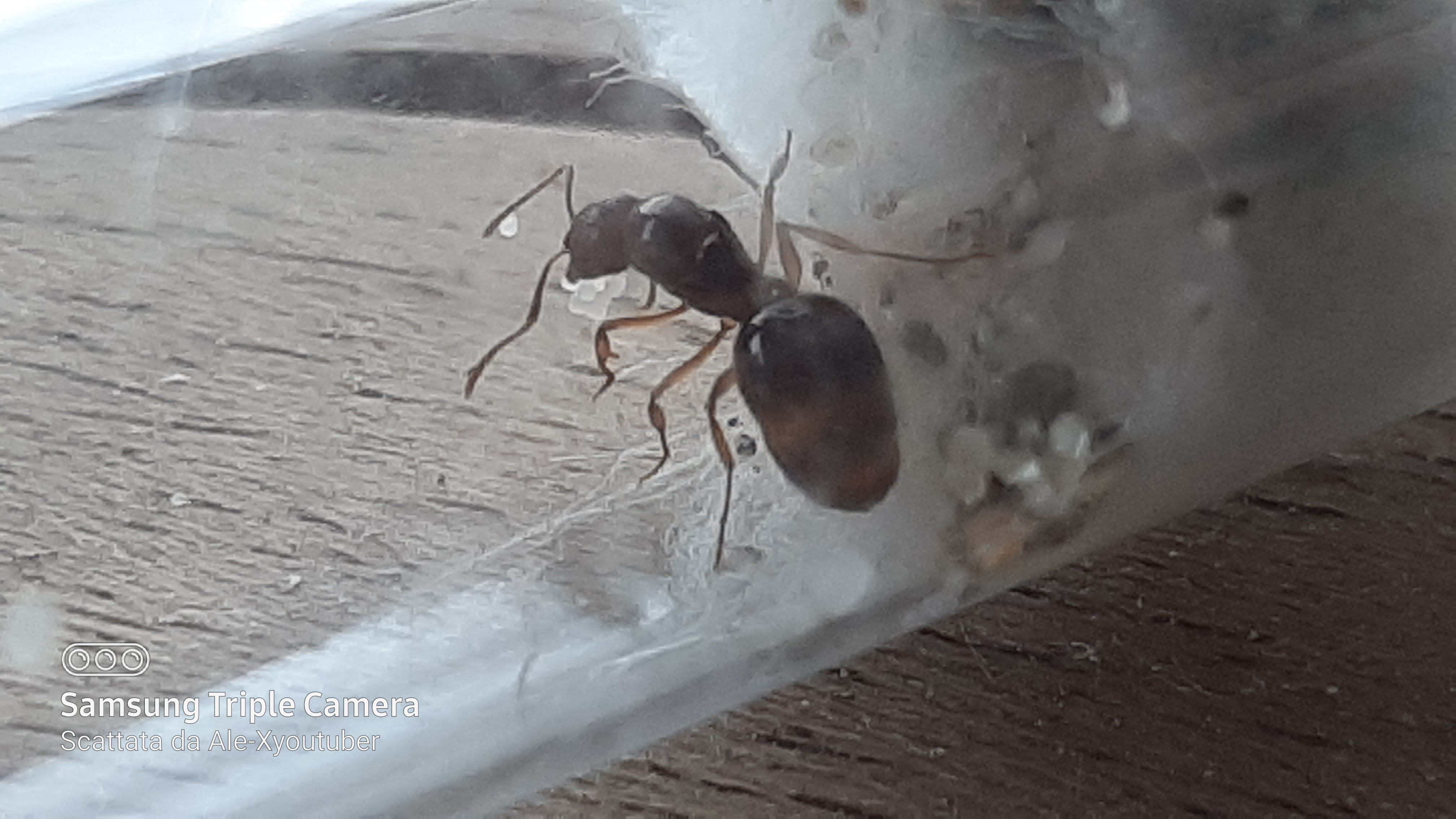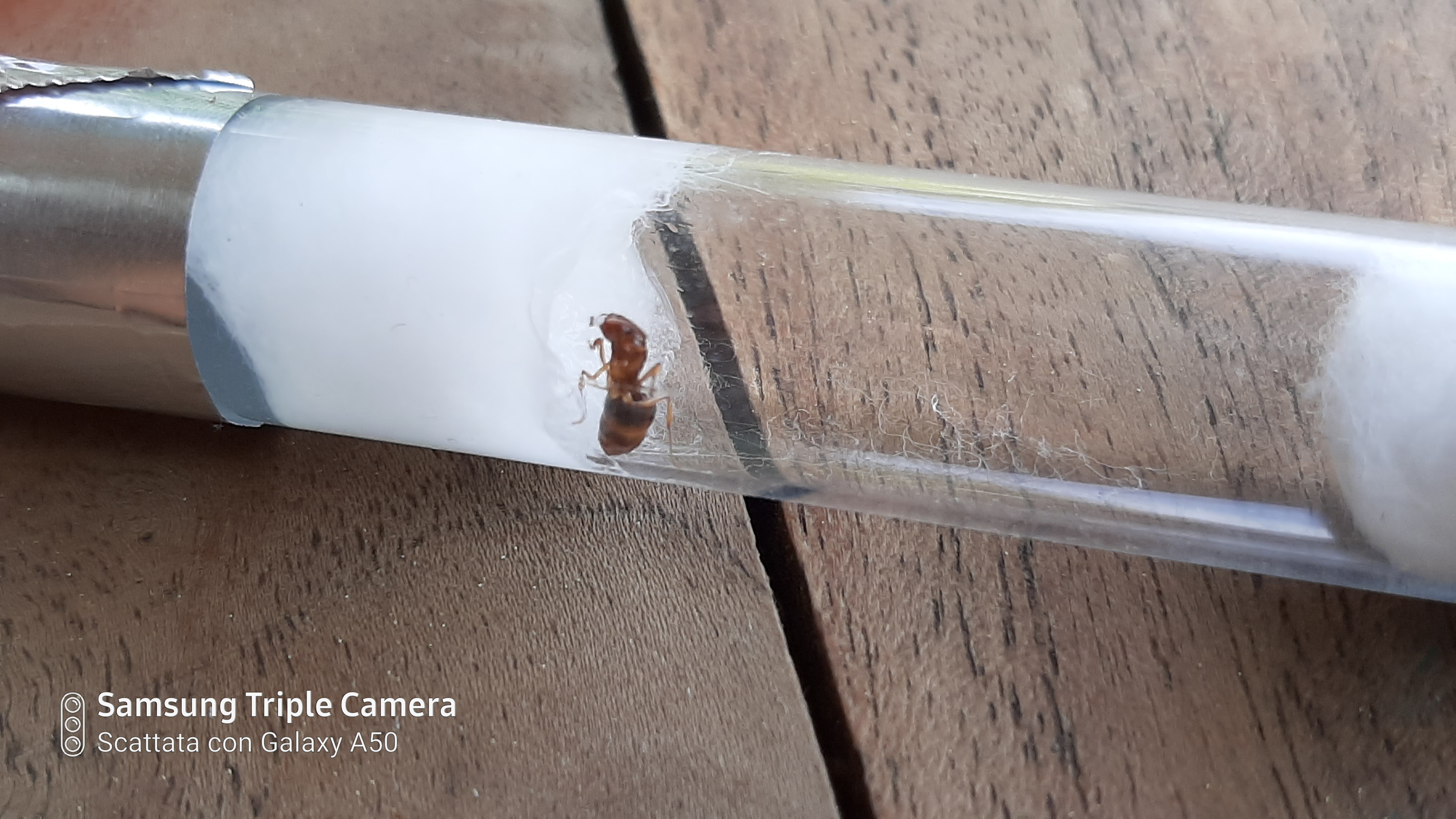 La seconda l'ho trovata su un tronco che vagava a caso. Appena l'ho messa nella provetta ha fatto uscire dal suo addome 2 gocce di uno strano liquido... in verità tutto l'addome è pieno di quel liquido...