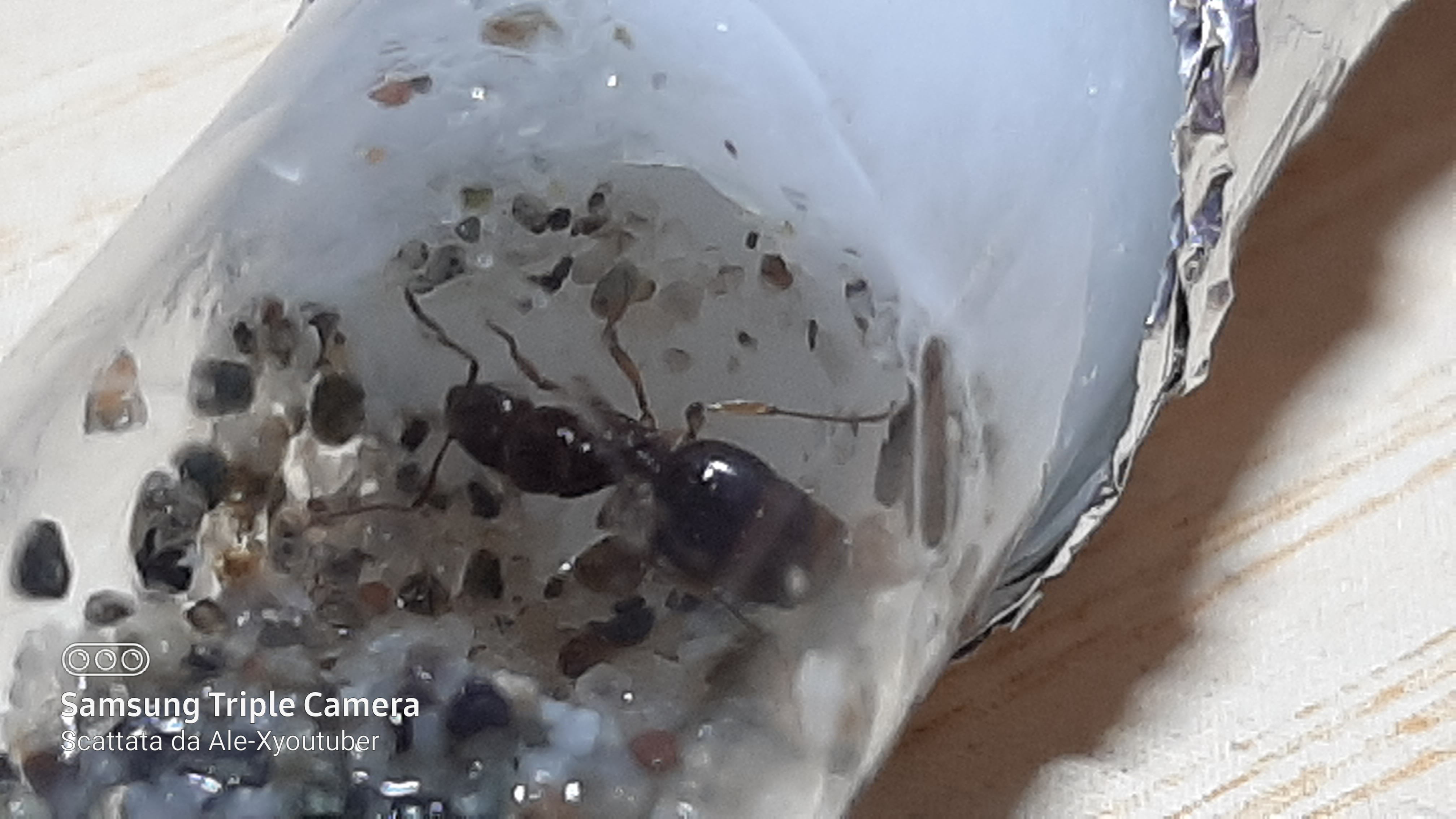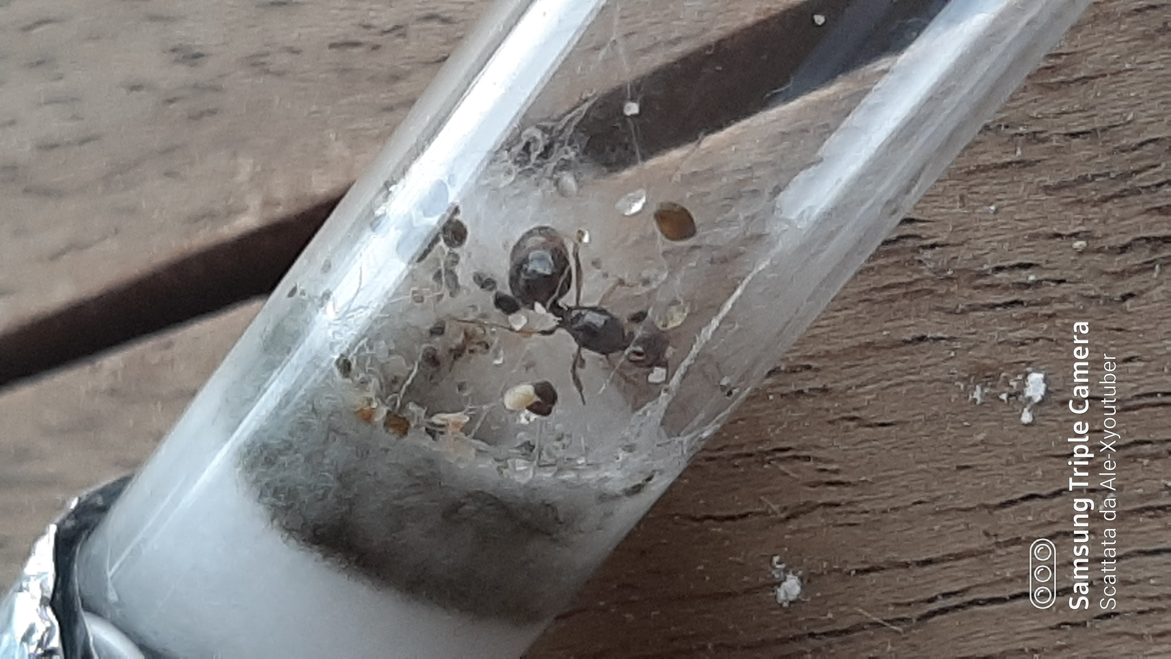 Accidenti... Non lo sapevo, però ho rimediato, creando una provetta esattamente uguale, senza sabbia. L'ho ricoperta di carta stagnola e ho lasciato che la regina si spostasse. Dopo circa 3 ore ha compiuto il viaggio e purtroppo alcuni granuli sono entrati in quella nuova... cmq ecco le foto delle uova!! Sembra proprio che le stia covando!