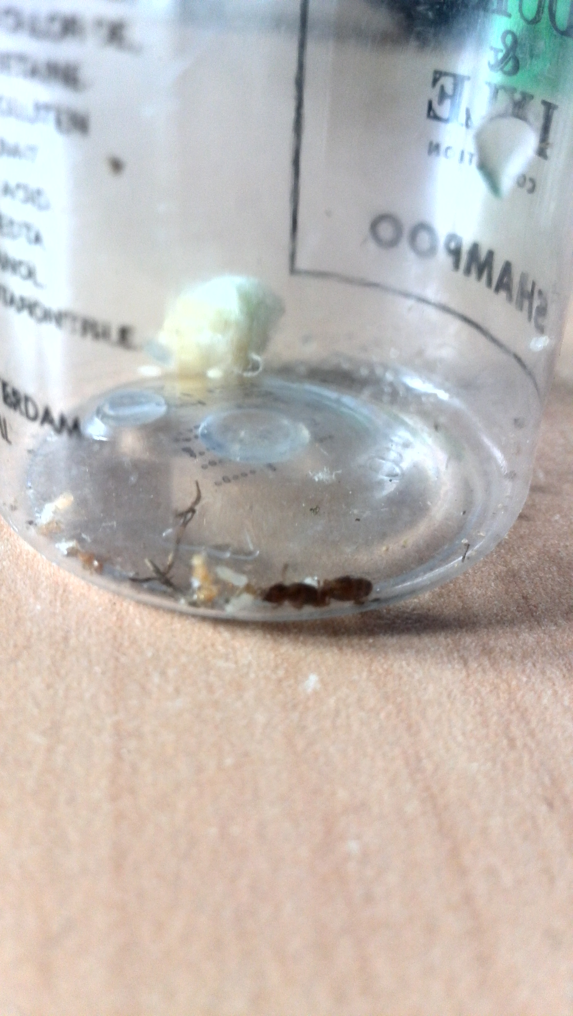 La "regina nello shampoo", malgrado la pessima foto, a mia senzazione dovrebbe essere Tetramorium sp., le pupe che ha sono (sempre secondo me) troppo grandi per Pheidole pallidula ma con foto così è molto, molto prbabile che abbiano ragione Vincenzo e Mirco, è un po come lanciare un dado.