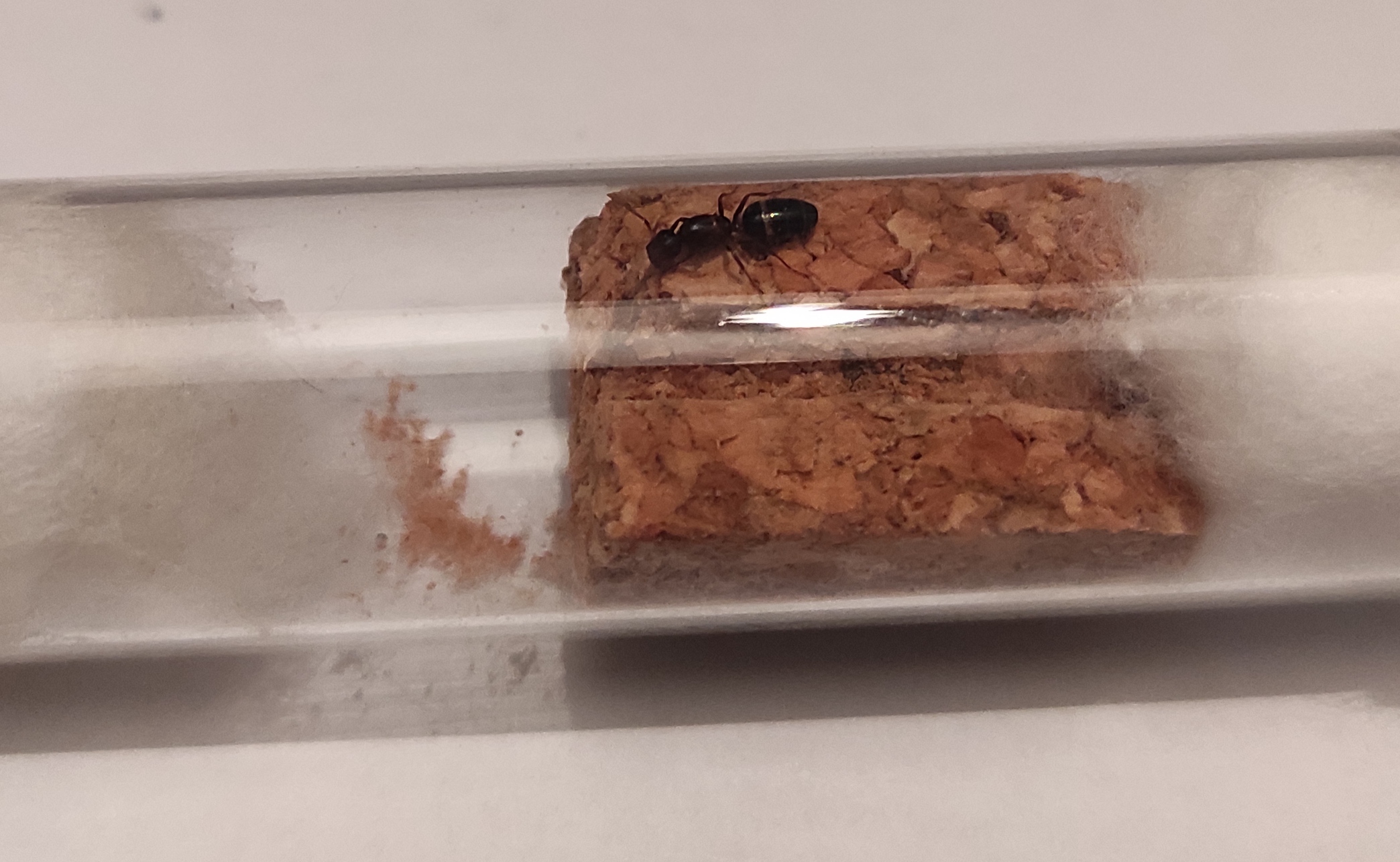 Salve, io allevo questa specie e sono molto bravo e esperto quindi se hai bisogno chiedimi tutto e ti rispondo il prima possibile. Come prima cosa partiamo con il dire che la regina di Colobopsis sp è molto delicata ed è semiclaustrale, quindi devi somministrare proteine durante la fondazione e anche dei carboidrati, come carboidrati ti consiglio acqua e zucchero e vai sul sicuro così gli dai delle energie. Devi dare carboidrati e proteine ogni 2/3 giorni in modo preciso. La cosa più importante per farla fondare è che devi fare una struttura (vedi nelle foto di come deve venire nell'esempio in basso) di sughero e devi mettere il tappo in verticale e ne tagli uno spicchio come se fosse una pizza (trovi esempio sempre elencato in basso) e poi gli fai una conca come una V in modo tale che lei ci entri e ci faccia le uova. Ti dico solo che è una regina molto lenta e quindi non preoccuparti se non ti fa subito delle uova alcune volte ci mette anche un anno. Aspetto tue notizie di come ti è venuta la struttura in sughero e allega qualche foto di come ti è venuta. Se poi ti dico che va bene c'è la metti dentro la provetta in modo che non tocchi il serbatoio d'acqua però. Aspetto una tua risposta se è tutto chiaro e di come ti è venuta quella cosa. A dopo.