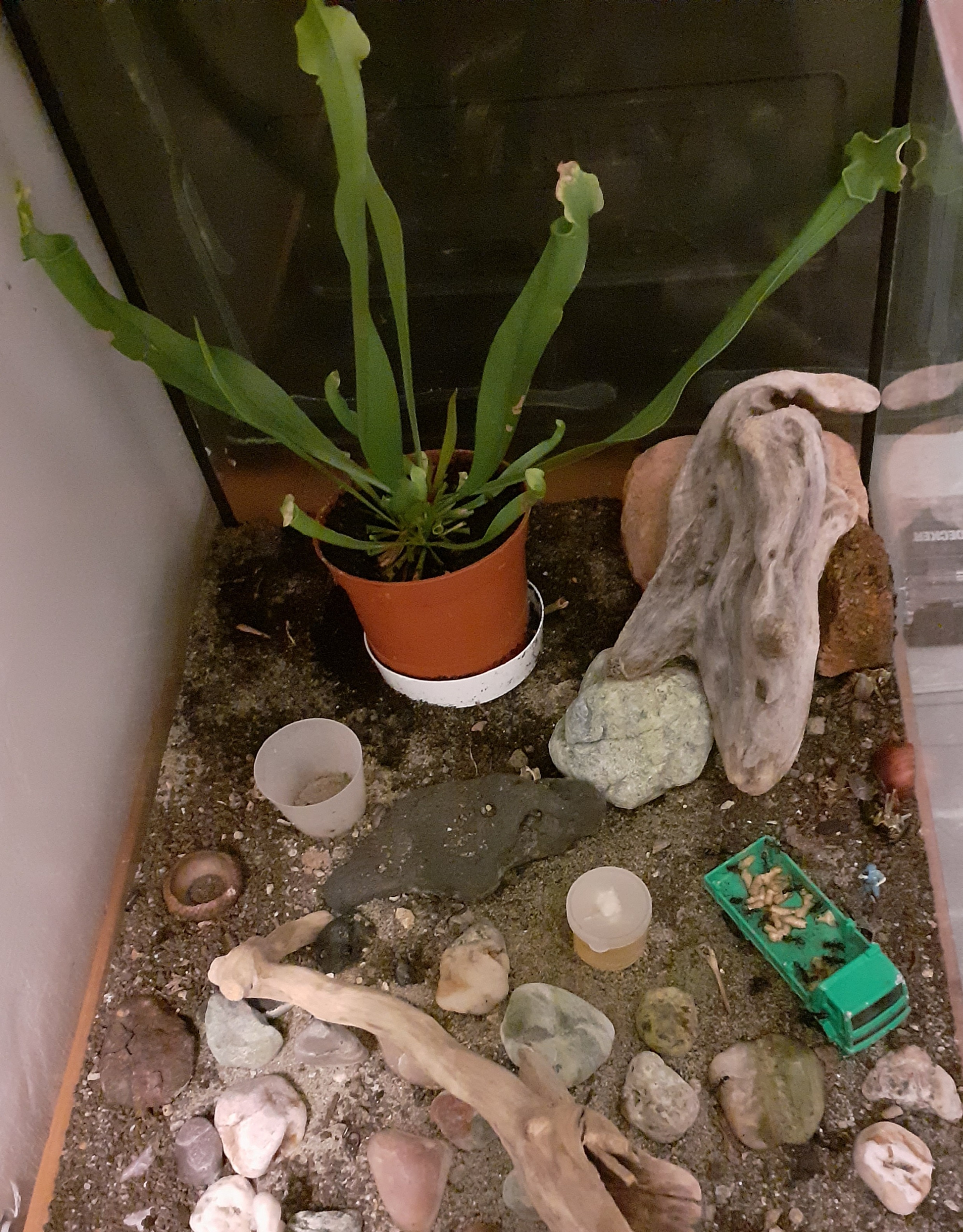 Veduta dell'arena con la pianta carnivora nel suo sottovaso per non diffondere troppa umidità nel terreno.