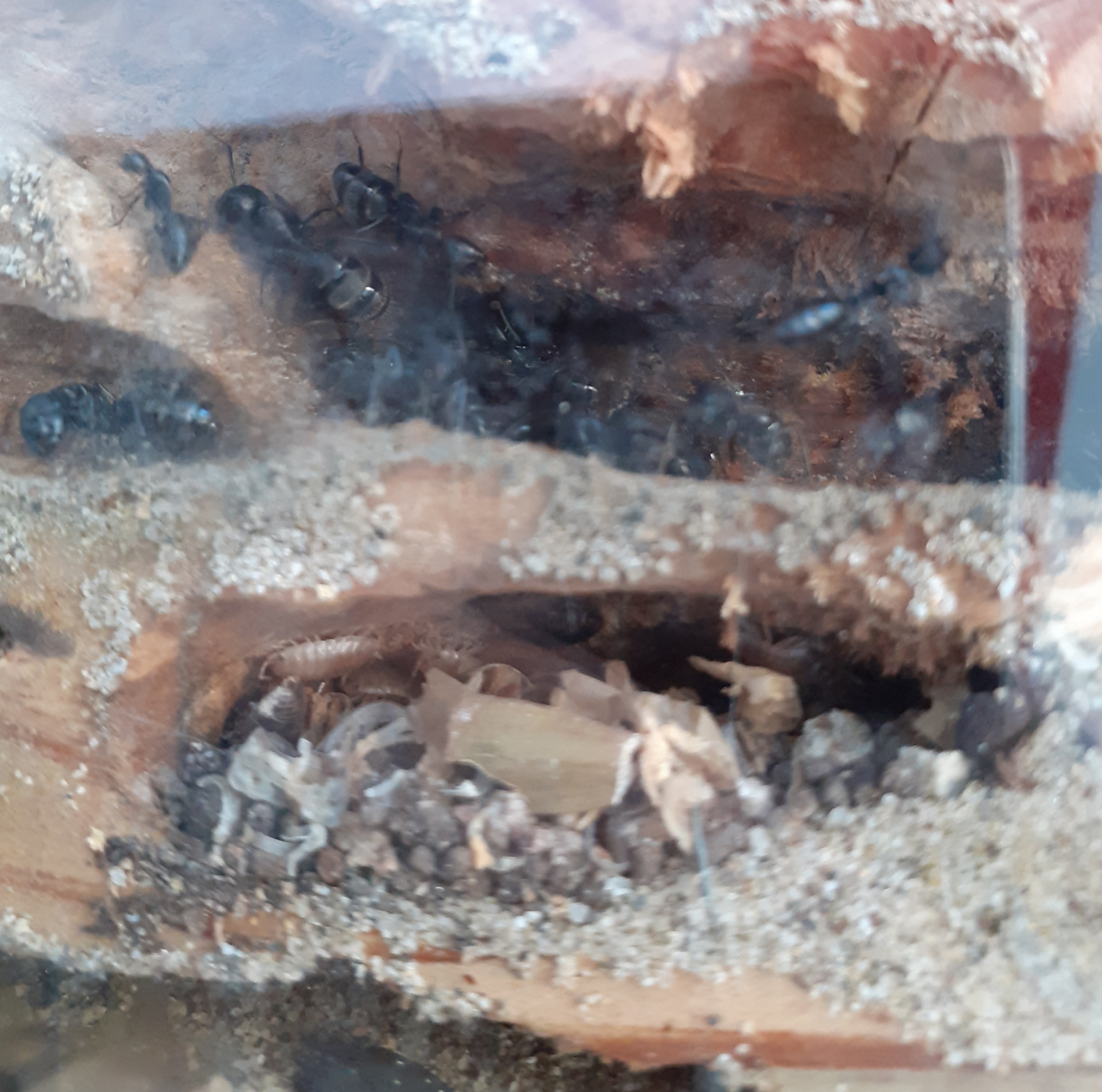 Comunque, il fatto che mi ha stupito di più è stato che solo in quella stanza le formiche hanno portato pezzetti di foglie secche e solo dopo che gli onischi si erano insediati, solitamente non se ne cibano, gli do insetti, frutta e acqua zuccherata in abbondanza, non mi sembra che si tratti di un semplice furto di cibo da parte degli invadenti miriapodi.