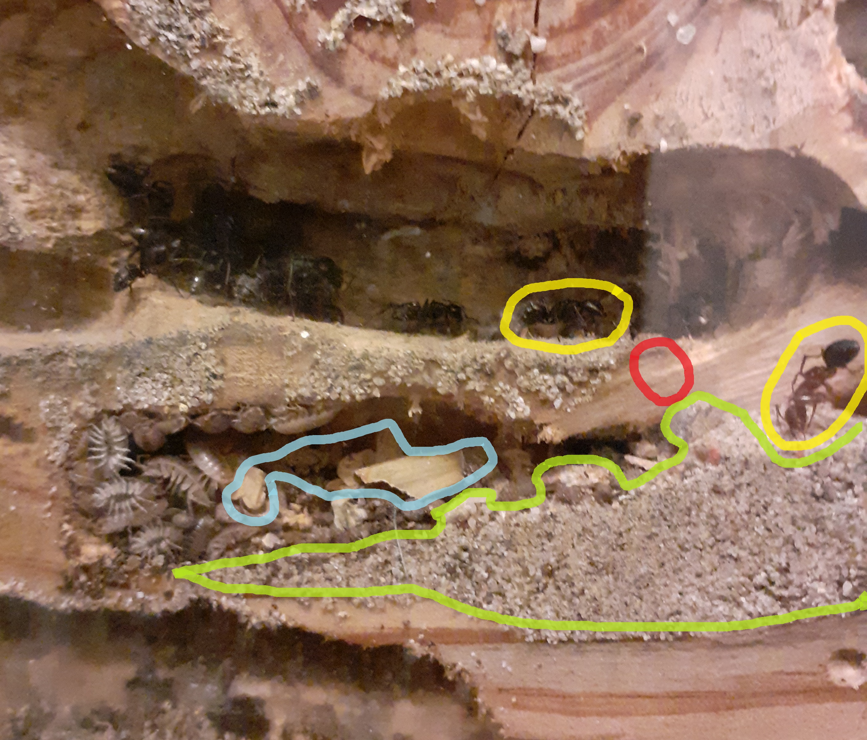 In giallo, Camponotus operaie che sorvegliano l'entrata dell'allevamento.