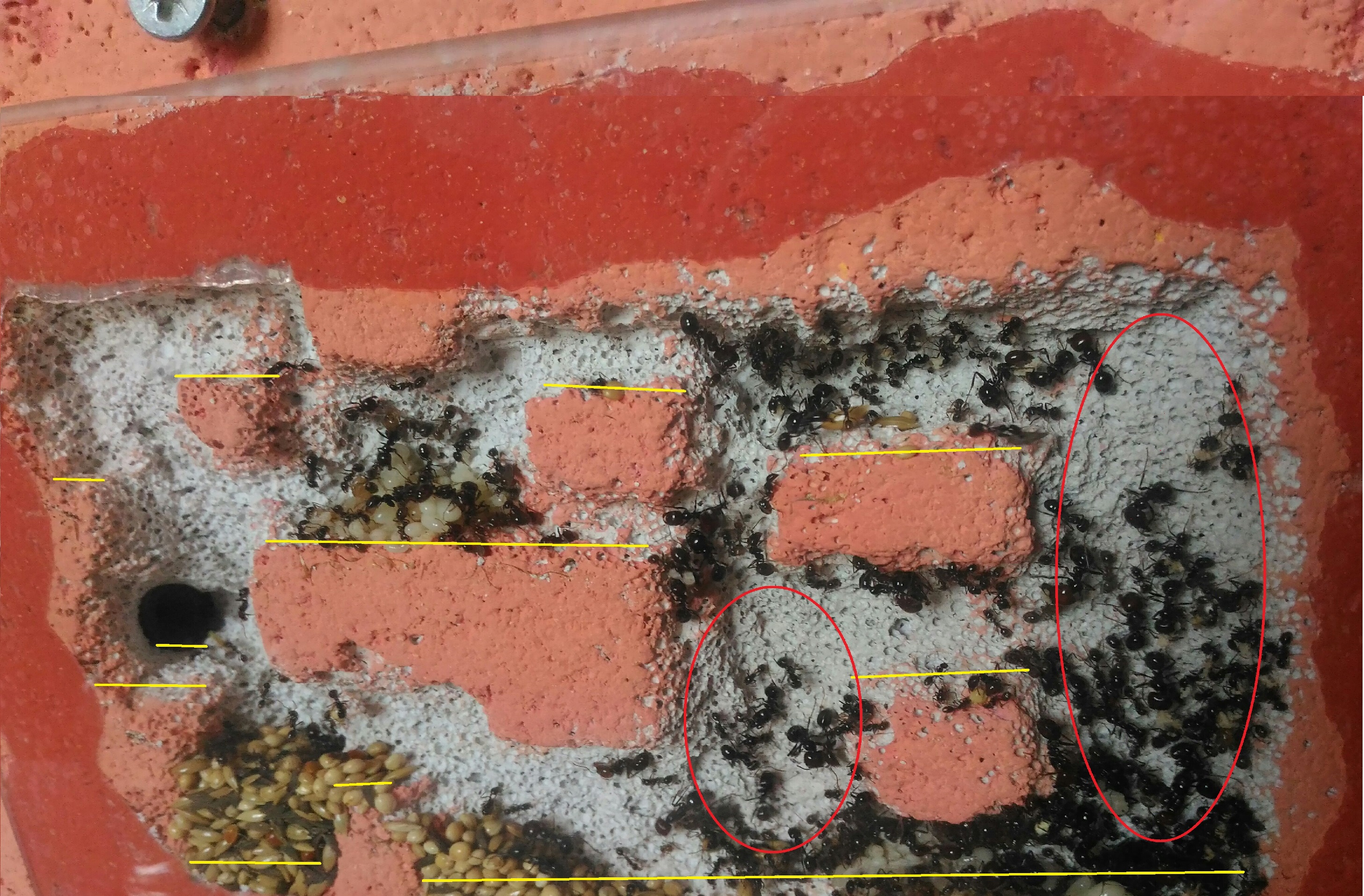 riguardando il formicaio, mi sembra più una struttura da formicaio orizzontale, vedi in giallo i piani di appoggio e in rosso due grandi spazi dove possono camminare ma non possono mettere nulla, ne semi ne prole