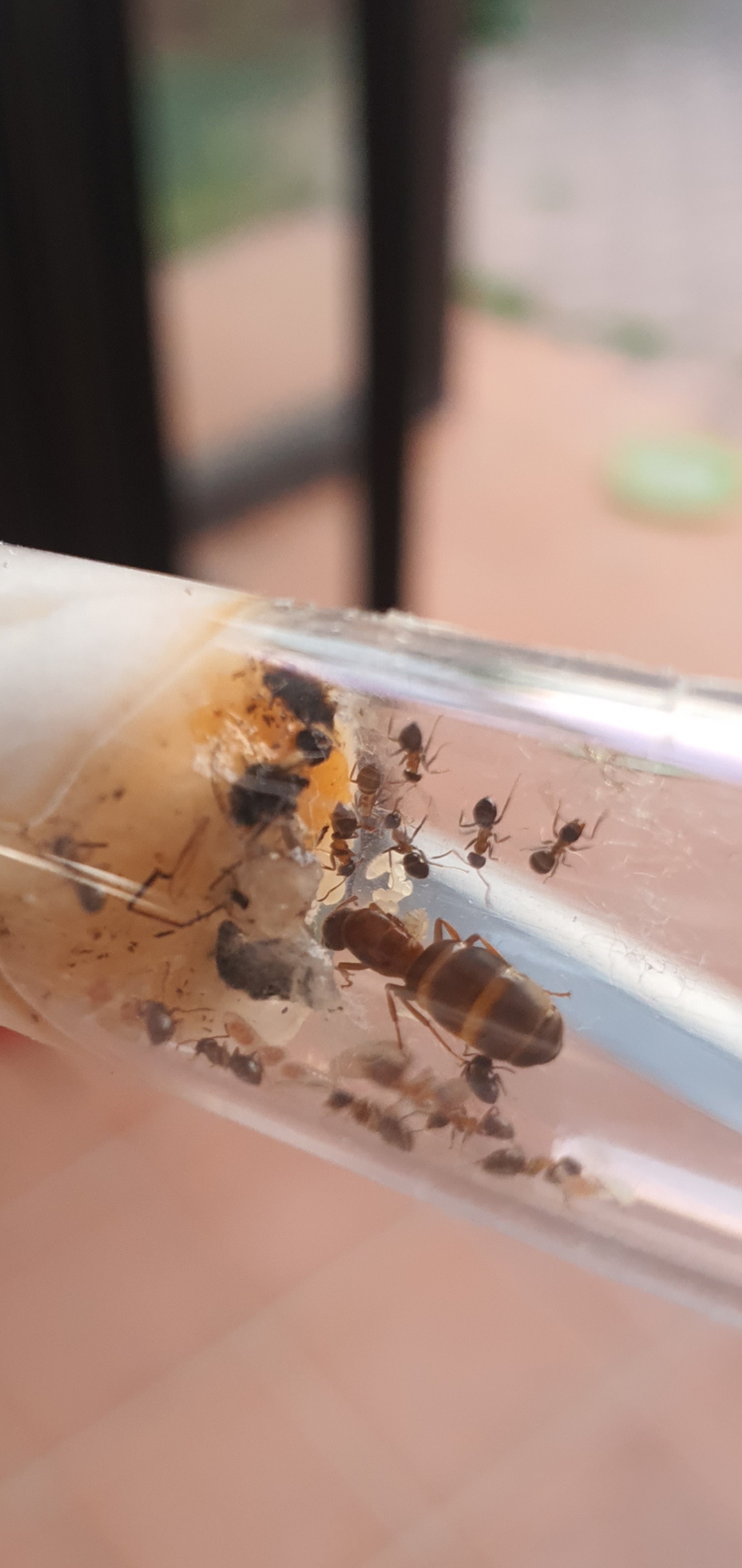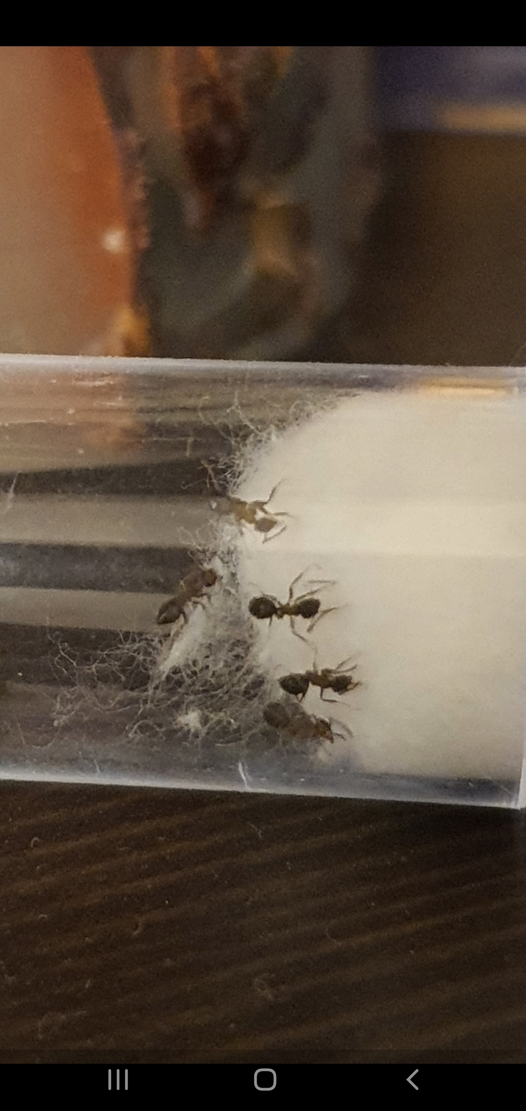 Colonietta di lasius emarginatus, conta poco meno di 20 operaie.. il cotone dal lato acqua é stato pressato poco ed é sempre inzuppato.. ma ho visto che gli piace l'umidità e sono sempre attaccate li..
