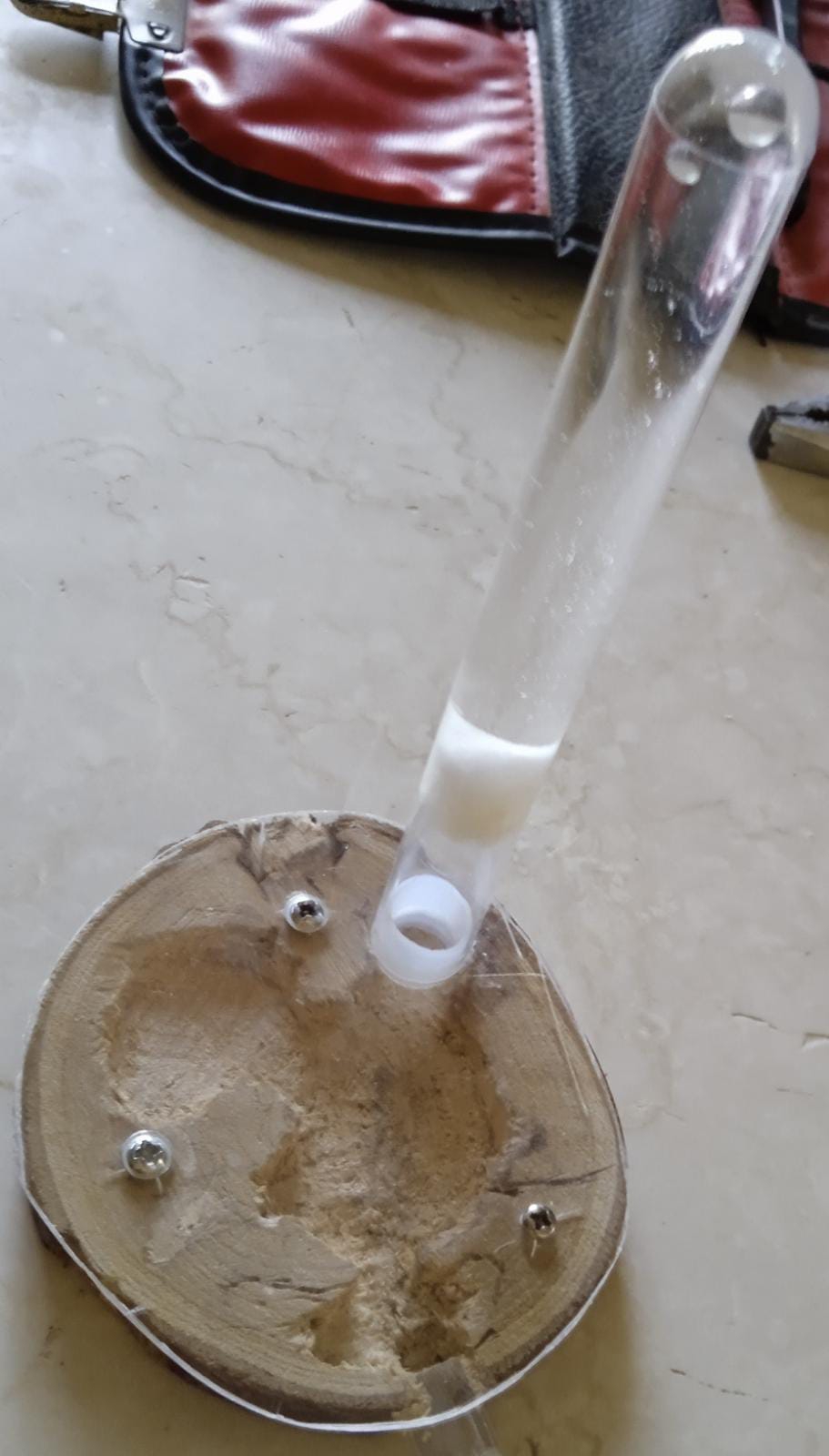 L' idea è di una sezione di un tronco con un coperchio rimuovibile e una provetta d' acqua, anch'essa rimuovibile quando la riserva idrica viene esaurita.