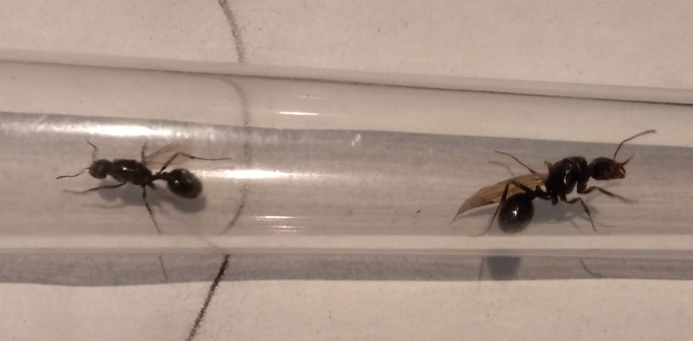 Ho raccolto due "alate" una leggermente piu grande dell'altra (quella a destra è piu grande). Non sono riuscito a distinguere maschi e femmine perche mi sembravano tutti circa con la testa della stessa dimensione, ma ho raccolto queste due (appartenenti a due formicai ad una decina di metri di distanza) perché entrambe hanno un'ala soltanto quindi ho ipotizzato che abbiamo fatalità entrambe provato a staccarsi le ali ma non ci siano riuscite completamente...