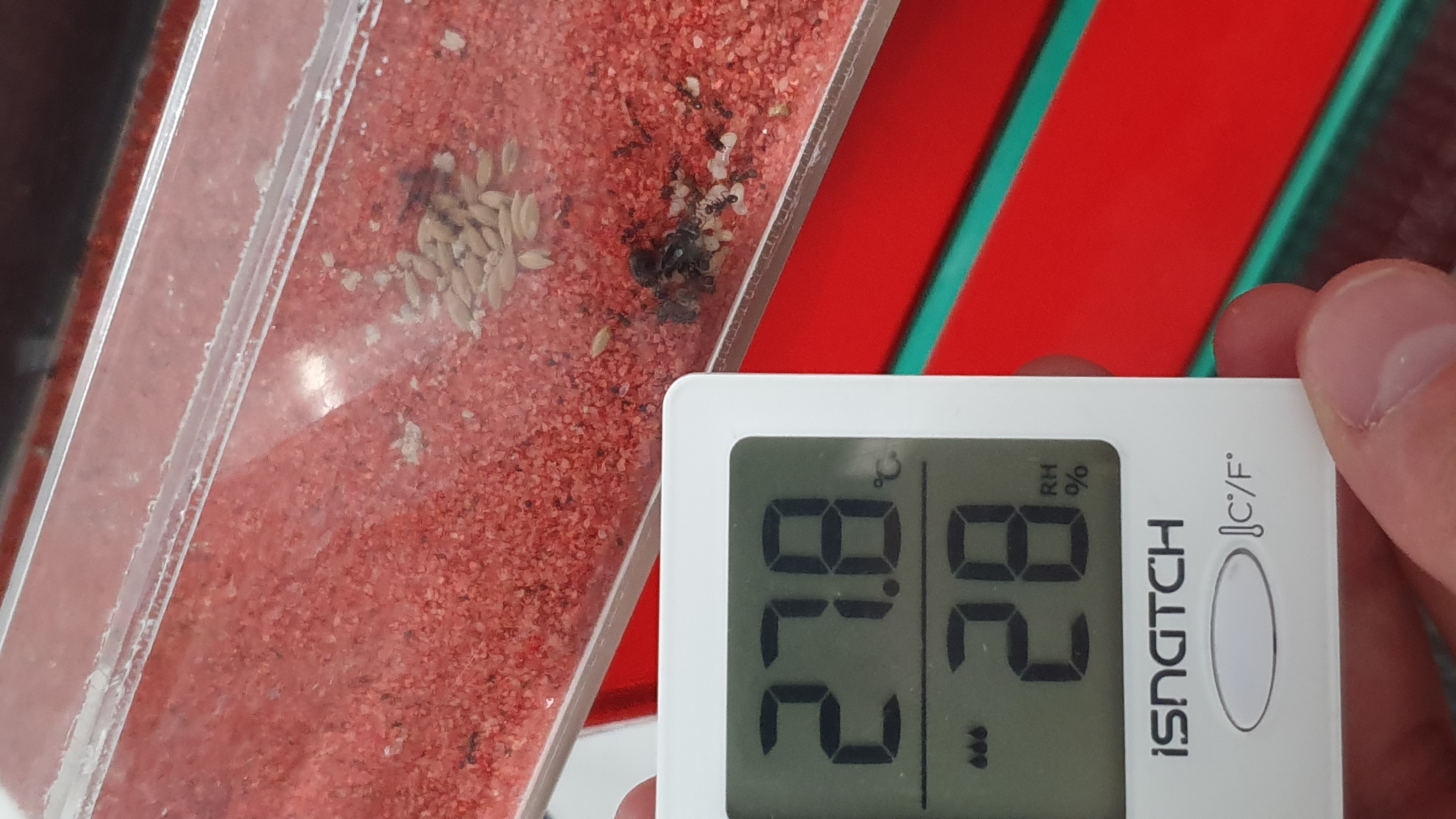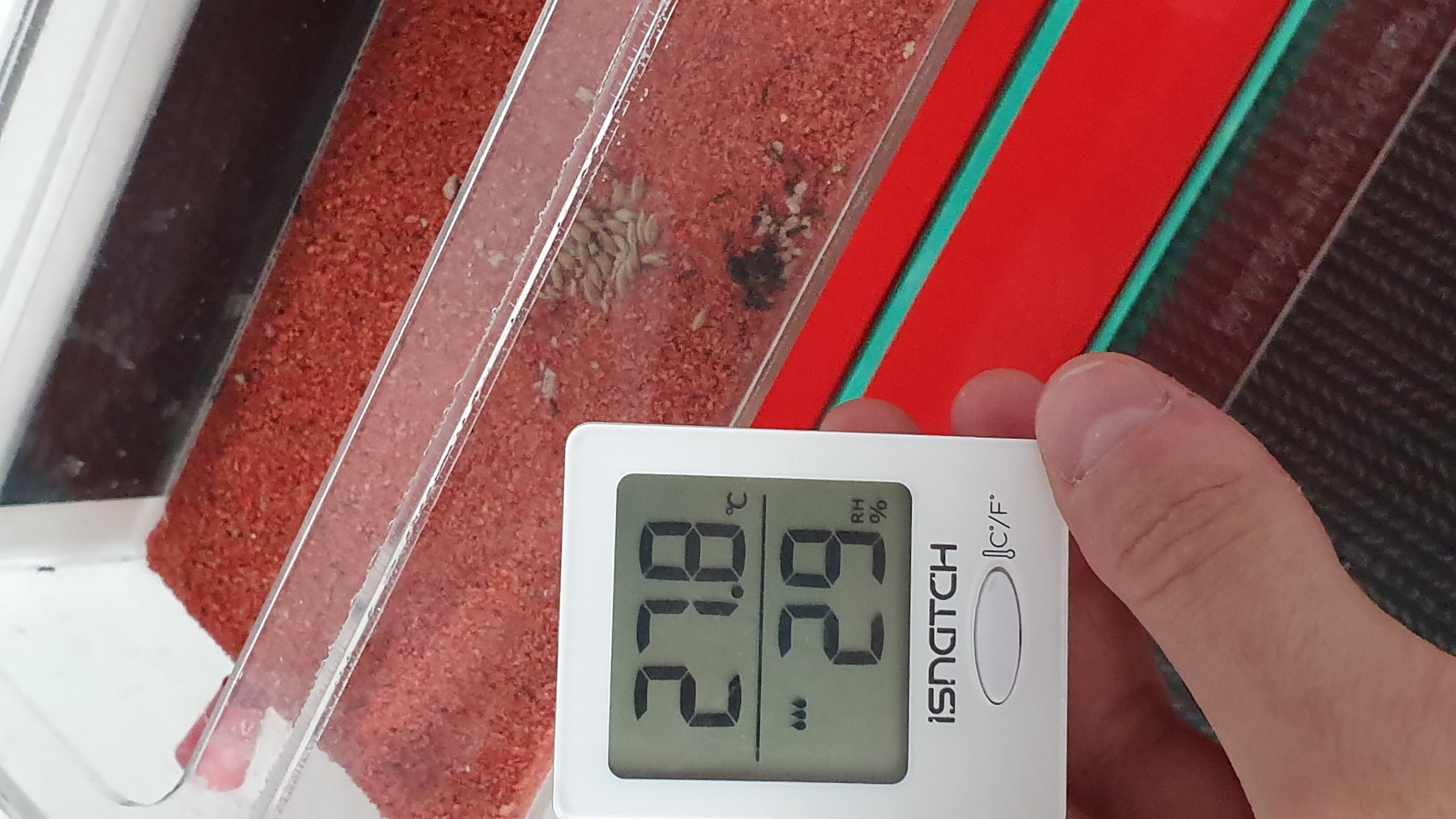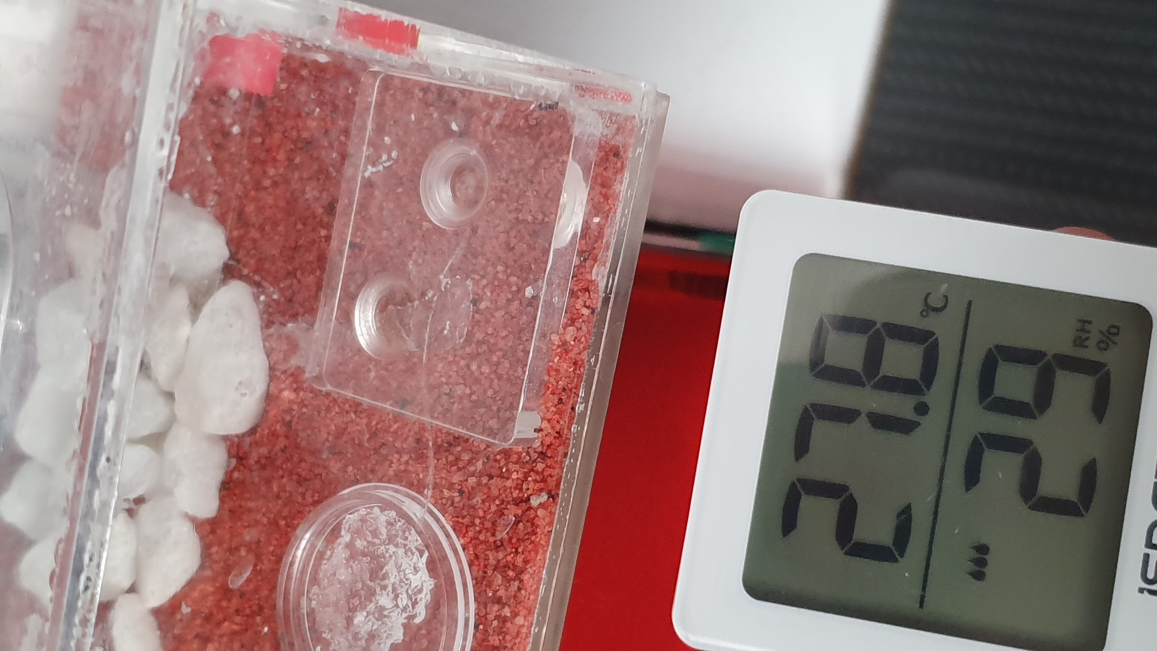 Il coperchio l'ho lasciato aperto siccome mi hanno detto che si può creare la muffa. Vi allego qualche foto con l'umidità e la temperatura. Devo chiudere la teca con il tappo oppure lo lascio aperto?