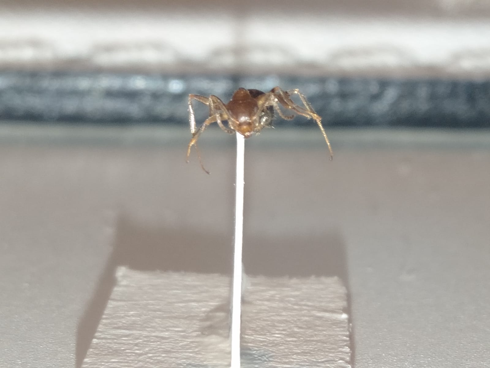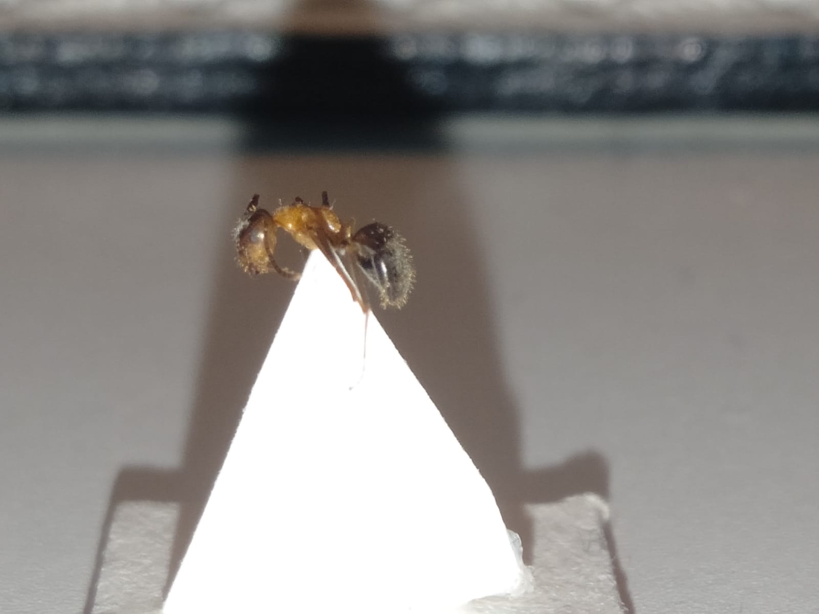 In pratica, in questi giorni ho deciso di portare una pianta che avevo in giardino sul balcone di casa, ma non mi sono accorto che dentro alla terra del vaso c'era una colonia di formiche. A me sinceramente mi sembravano Lasius emarginatus, ma sinceramente non ne ho mai viste di così grosse (stiamo parlando tra sei e sette mm per le più grandi, che mi sembra sia fuori dalla portata della specie). C'è anche da dire che nei giorni che sono state sul balcone hanno cominciato ad allevare gli afidi che erano nell'edera, e quindi erano diventate veramente ciccione. Per di più penso che lo spazio che avevano non gli bastasse perchè sono anche andate a fare una specie di nido secondario sotto ad un vaso. Quello che posso dire è che avevano il pungiglione (ho controllato personalmente) e l'acido formico (ho controllato sempre personalmente), anzi, ne producevano così tanto (forse non sapevano dove mettere il cibo in eccesso), che quando ho sollevato il vaso si sono fritte contemporaneamente a vicenda con l'acido. Mi si è quasi sciolto il naso dalle esalazioni. Ho approfittato di quel momento per provare a conservarne una. Così l'ho messa sotto aceto e alcol e poi l'ho messa su un cartoncino. Vi allego le immagini ma per favore, fate finta che non sia un campione, fa veramente pena ma serve allo scopo per lo meno.