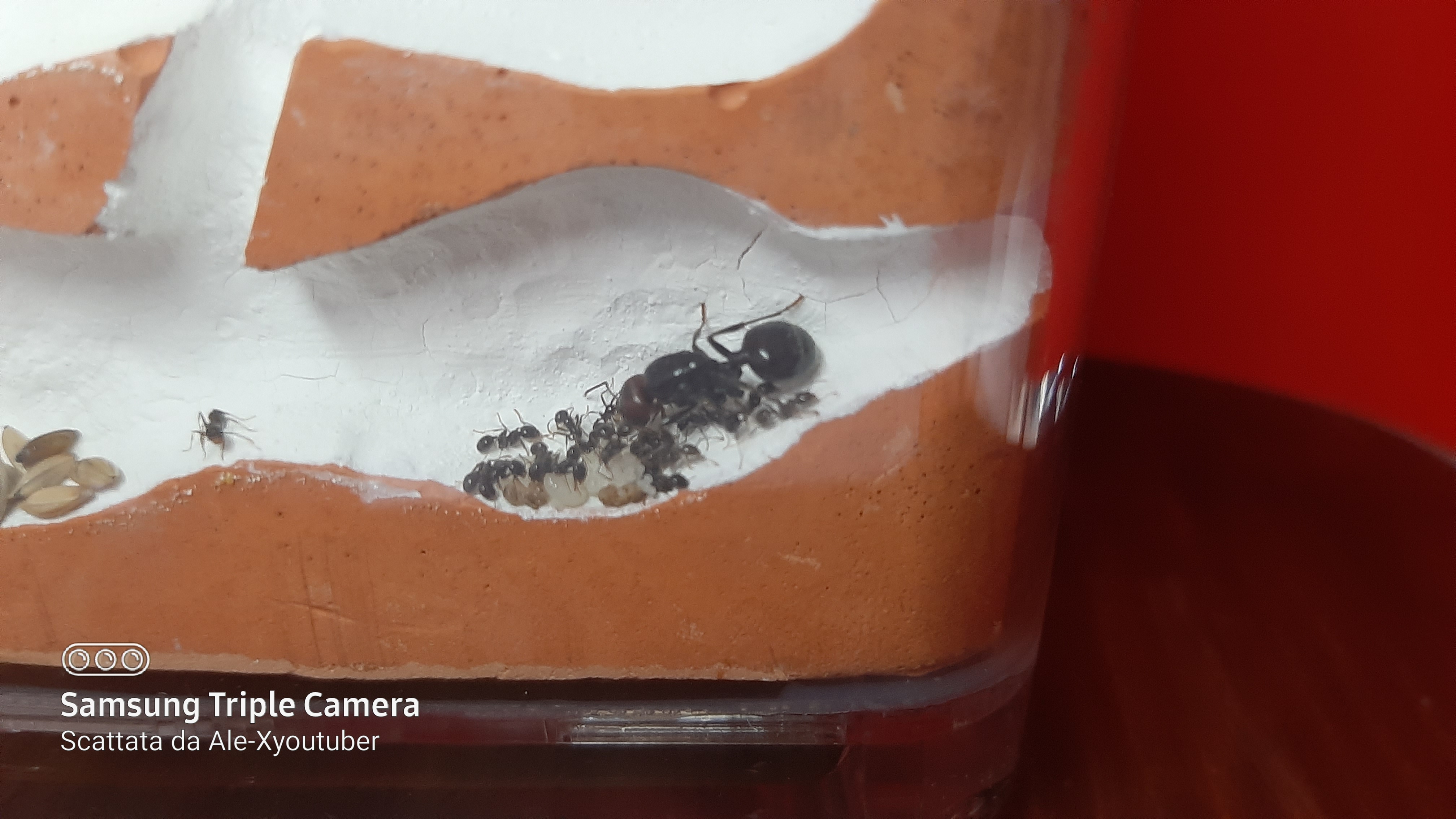 Purtroppo ho scoperto solo poco dopo che le formiche hanno bisogno di poco spazio per vivere... io prima pensavo il contrario, ma ero ancora molto inesperto. Vi allego come ora è la situazione, e come voi dite, una stanza è occupata dalla spazzatura, tutte le larve e pupe della scorsa foto si sono schiuse portandole ad una popolazione di 30 operaie e qualche media. Nonostante ciò la regina non fa più uova come ben potete vedere, e sono molto preoccupato. È possibile quindi che per lo spazio eccessivo non si senta a proprio agio e non faccia più uova? Credo di di... il formicaio inoltre ho un buchetto dove ho attaccato la provetta dell'acqua. Proverò a cambiarla, con una più grande, puntare una luce sul nido e vedere se entrano lì... allego quindi la foto della provetta che ho a disposizione. È piuttosto grande rispetto a quelle classiche e secondo voi quanta acqua devo mettere?