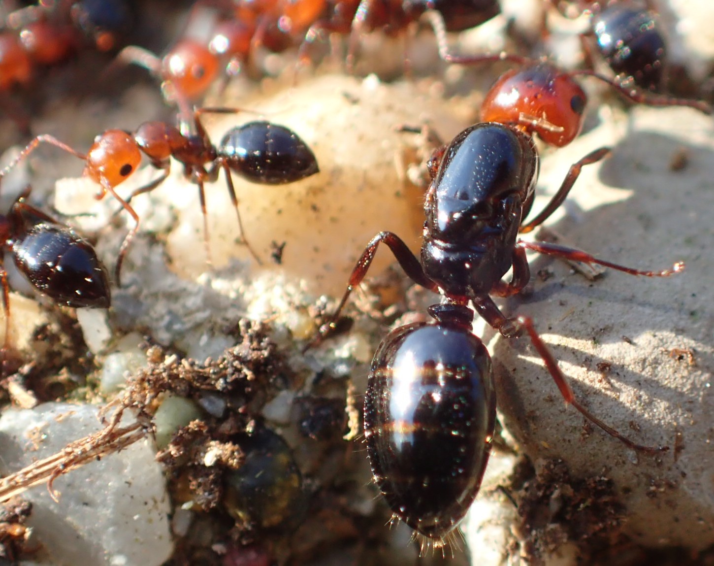 Oggi, Castelleone (CR), sotto una pietra in una vecchia discarica ormai "naturalizzata"; mi sembrano delle rizzaculo (un pochino più panciute del solito, non vedo neanche le spine che di solito hanno sul propodeo...) ma quelle che ho a casa, a differenza di queste, hanno il torace nero e mi sembrano tutte delle stesse dimensioni (qui, regina a parte, ci sono formiche molto più grandi di altre).