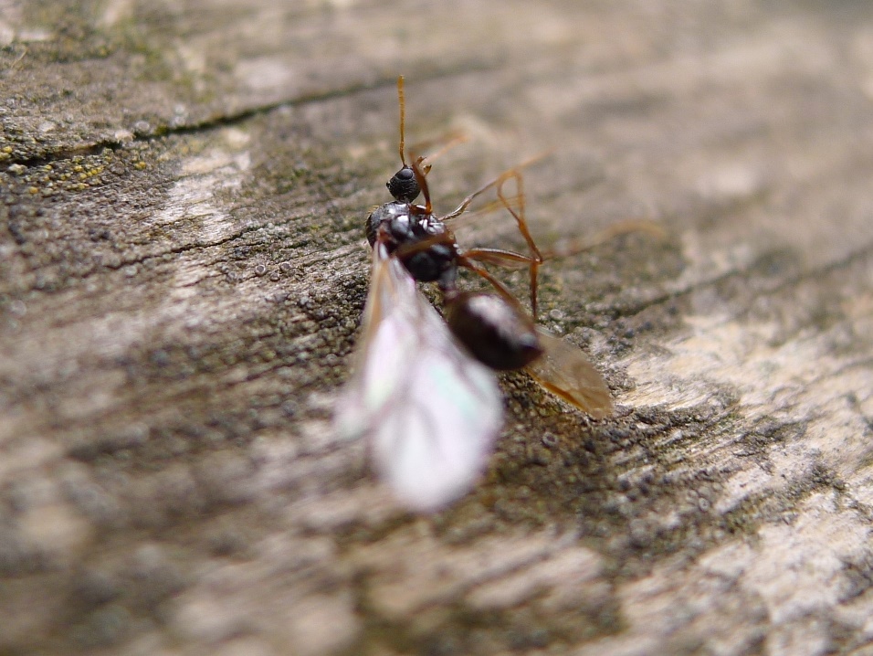 Quello è uno dei tre ocelli. In molti artropodi, assieme agli occhi composti, ci sono gli ocelli. Sono degli organi che servono soprattutto a percepire la luce polarizzata, e sono quindi utili per l'orientamento, dato che permettono all'animale di avere sempre come riferimento la posizione del sole. In alcune specie di formiche sono presenti anche nelle operaie; nei sessuati alati (in quelli atteri ed ipogei no) sono praticamente sempre presenti e molto sviluppati, anche nel caso di specie in cui le operaie sono completamente anoftalme. Questo perché, anche se la specie è ipogea, se i sessuati si accoppiano in sciamatura, per loro è comunque utile il senso della vista e quindi anche la presenza degli ocelli, durante quell'evento della loro vita.