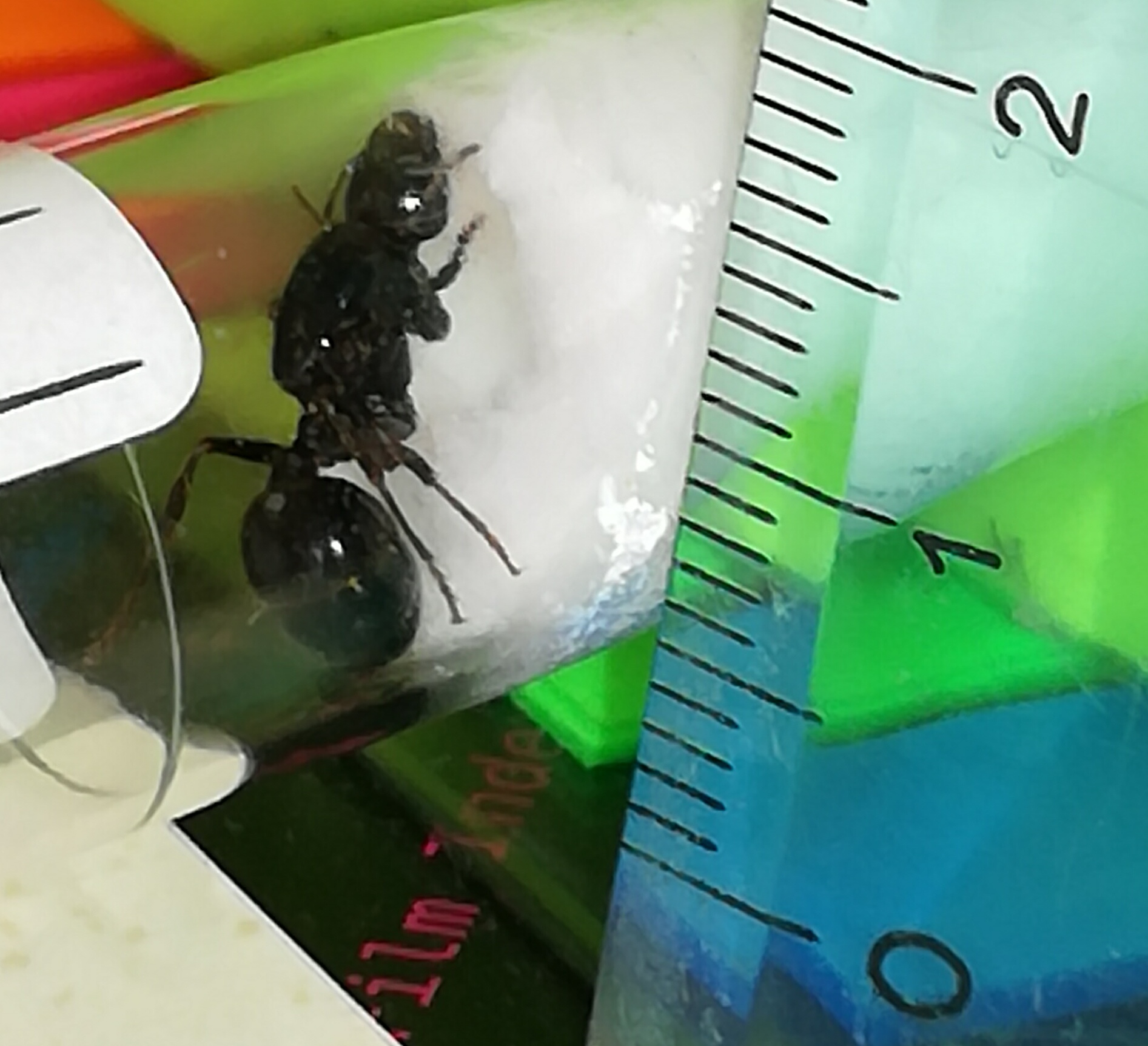 Ha le zampe leggermente rossicce ma la testa no, solo le mandibole tendono leggermente (ma propio leggermente, quasi non si vede) al rosso