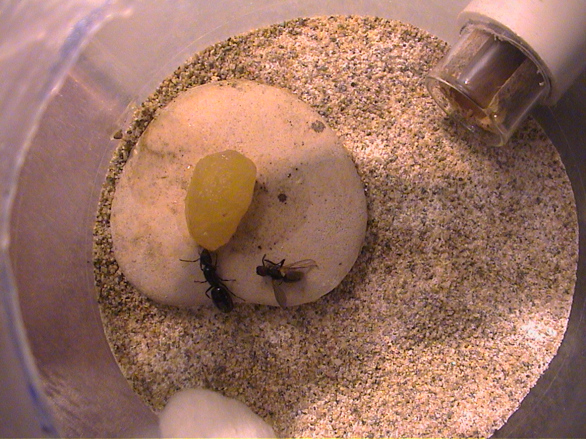 Un paio di giorni dopo da questa sistemazione, ho inserito in arena, sotto un piccolo pezzo di corteccia, un paio di bozzoli di Camponotus vagus della colonia rimasta orfana della regina.