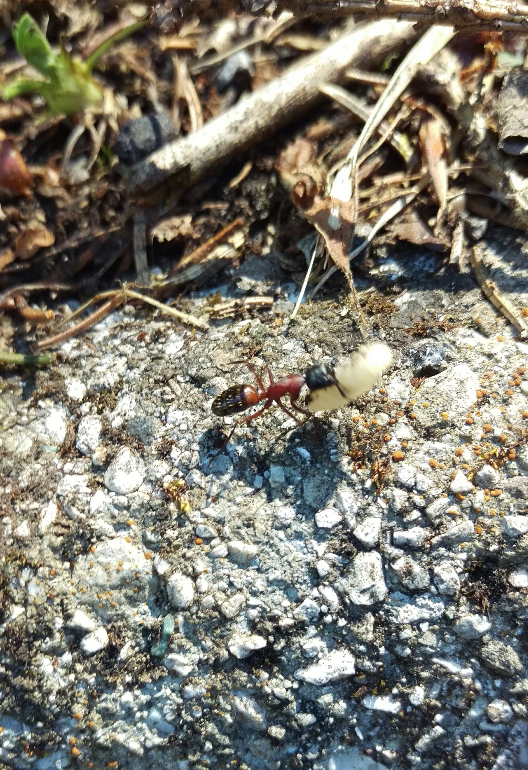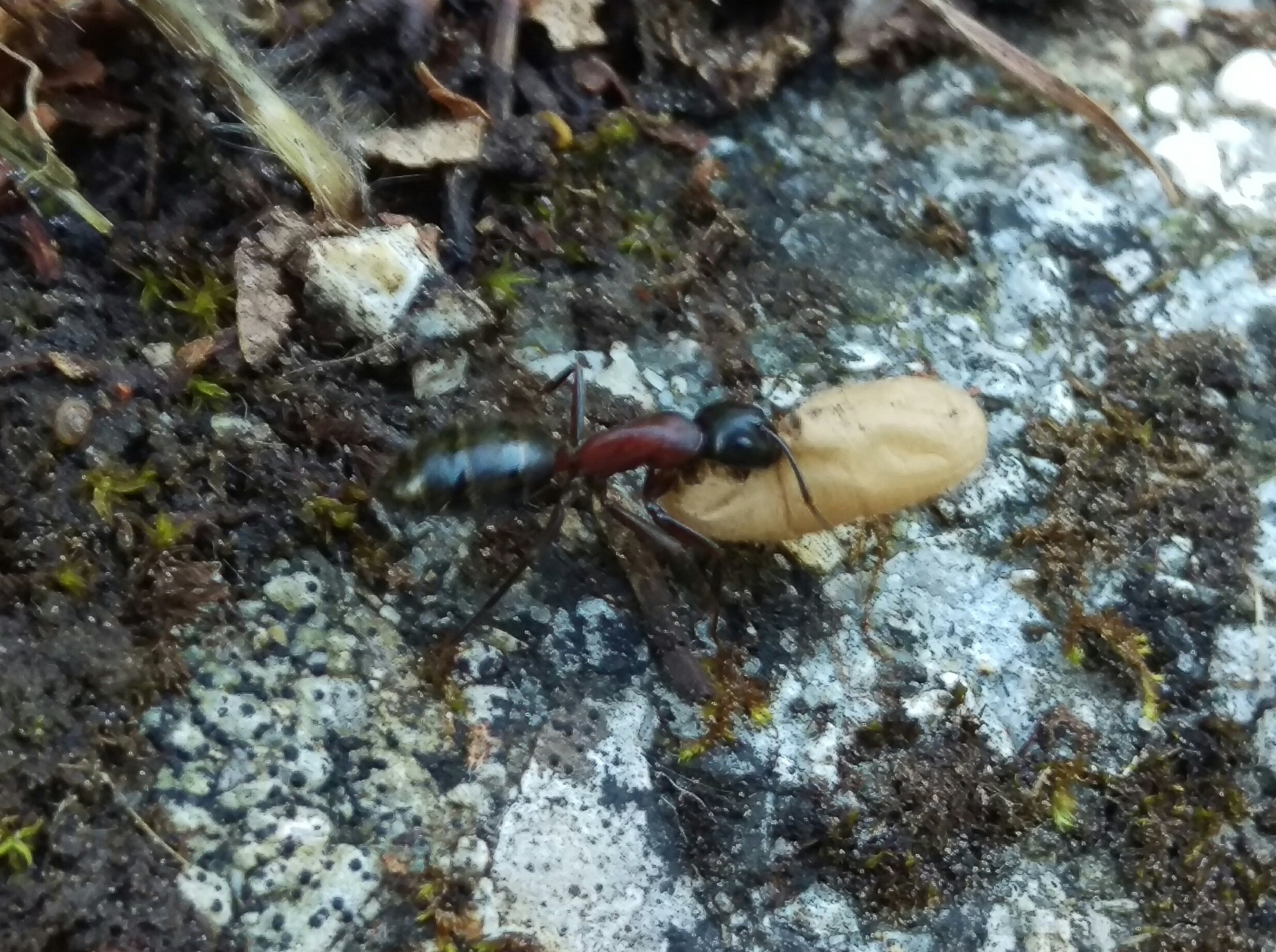 Oggi ho fotografato con il telefono due operaie intente a sollevare un grosso peso lungo una gradinata. Dall'aspetto deduco che si tratti di Formica sp., ma non riesco ancora a distinguere le varie specie. Qualcuno può aiutarmi? Non riesco a fornire informazioni sul tipo di nido perché non l'ho trovato. Altitudine 900 metri.