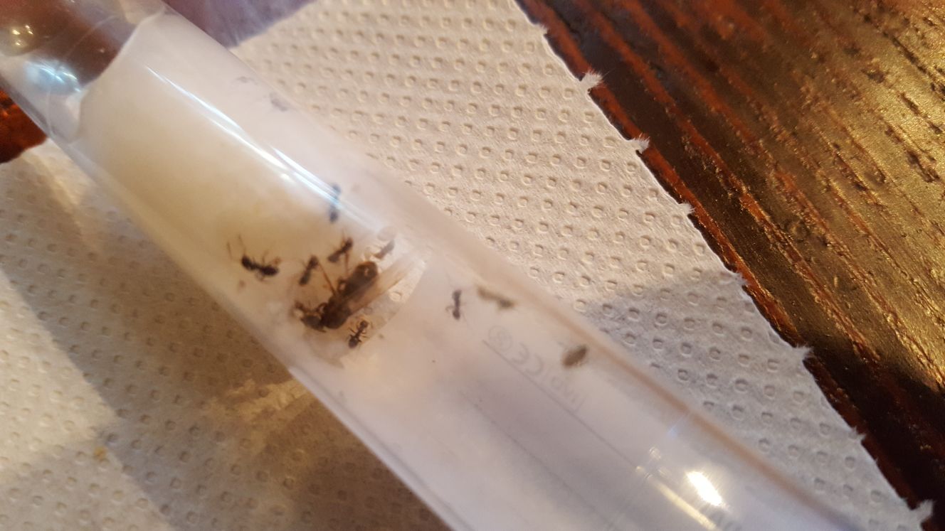 lo stesso giorno ho raccolto anche un altra regina, che si presenta di dimensioni simili ma completamente nera, è stata raccolta nell acqua della piscina con due maschi attorno, il nido era evidentemente in terra nei pressi di una pianta nelle vicinanze della piscina. l'acqua era diventata completamente nera di formiche, il 99% erano maschi