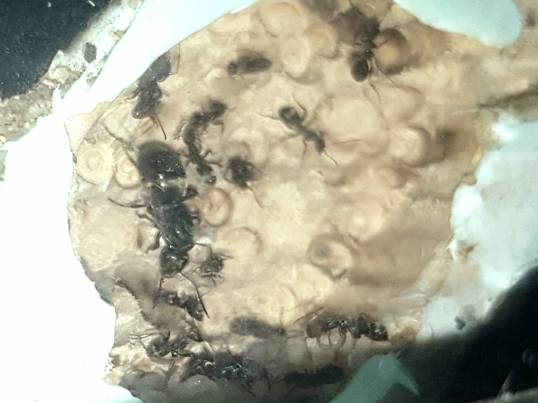 Credo possano essere Formica sp. anche se non riesco a vedere alcuna peluria né a occhio nudo né con la lente. La colonia ha fondato da qualche mese e sono finalmente riuscito a trasferirla con successo anche se si sono date allo scavo dell'arena...