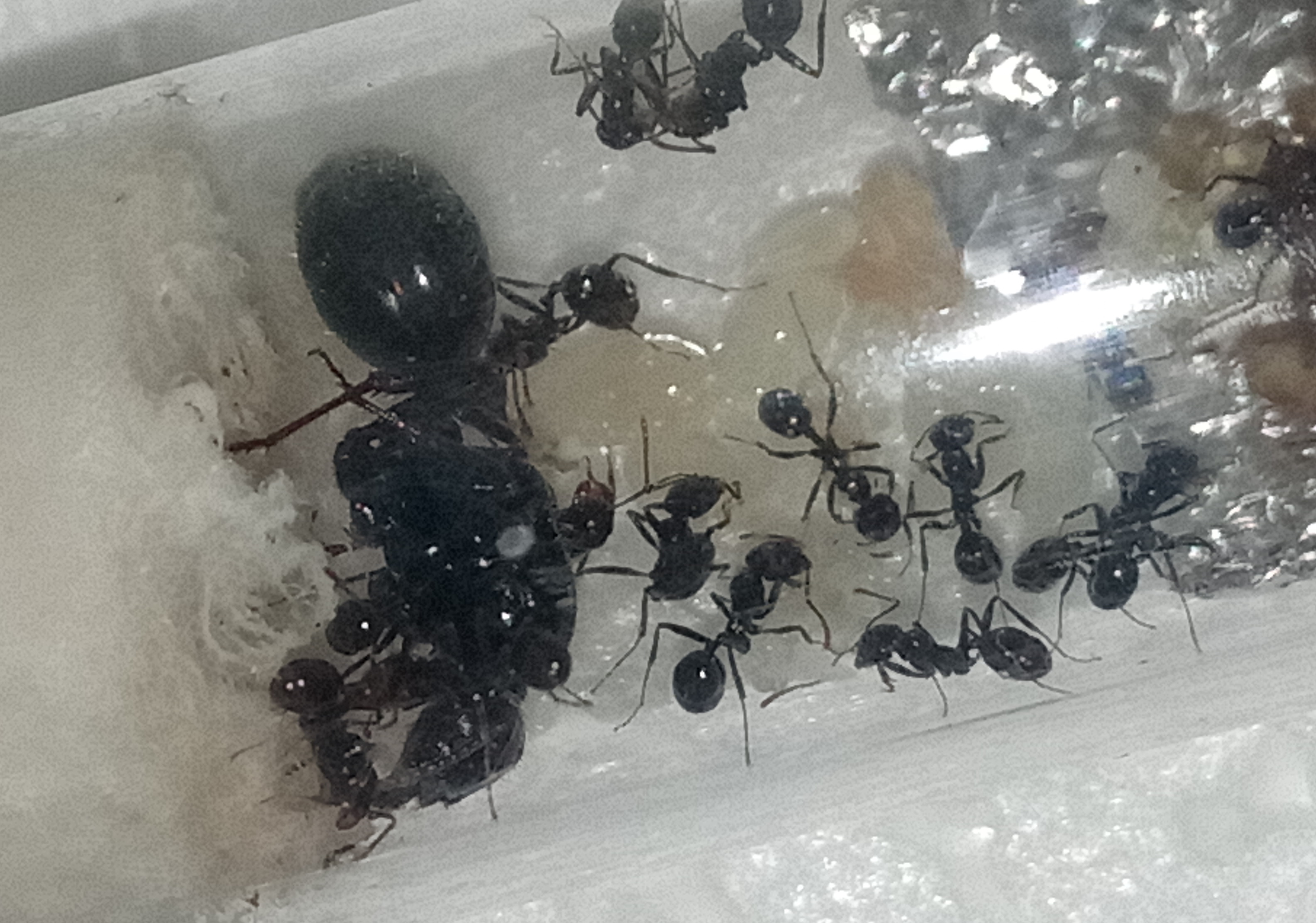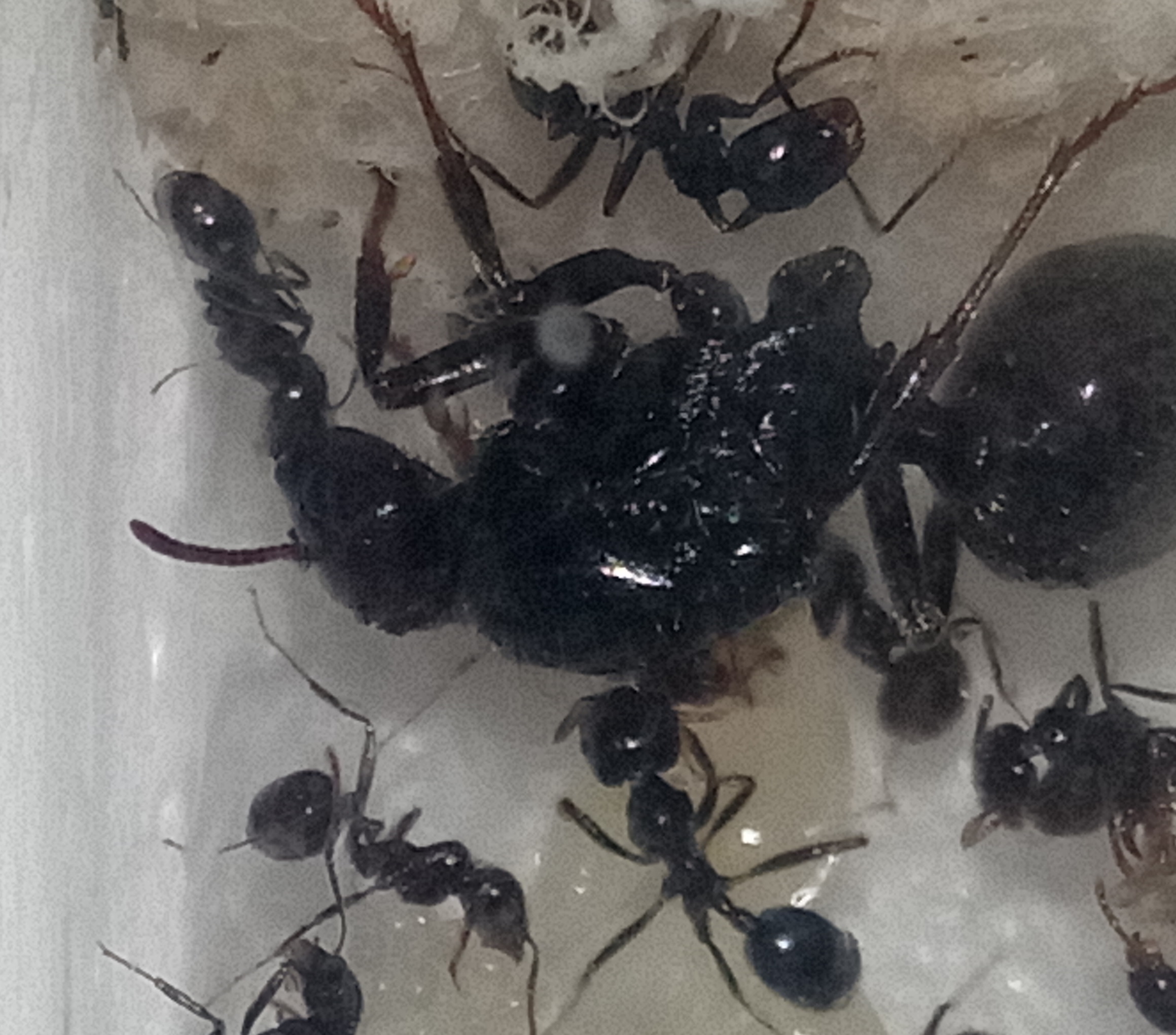 Al che mi viene un dubbio... Lo scorso autunno, più precisamente tra fine Settembre e la metà di Dicembre sono stato in viaggio tra Spagna e coste Portoghesi alla ricerca di onde, e quella sacca, appunto, è stata per molti giorni lasciata aperta su terrazzi o giardini di quelle zone. Mi chiedo dunque se sia possibile che questa regina sia in realtà unaMessor barbarus capitata nella sacca durante quei mesi per poi svernare nel mio garage fino al fortuito ritrovamento. Ad oggi, dopo poco più di 2 mesi dalla messa in provetta, la regina presenta quasi 20 operaie e una discreta covata. Nonostante dalle foto si noti poco, assicuro che anche molte (non tutte)delle operaie presentano una colorazione rossastra più o meno marcata del capo! La regina misura circa 15mm e le sto allevando seguendo le indicazioni per le Messor sp.... Mi scuso per la scarsa qualità delle foto e chiedo se siete in grado di definire quale specie di Messor mi sono ritrovato ad allevare!