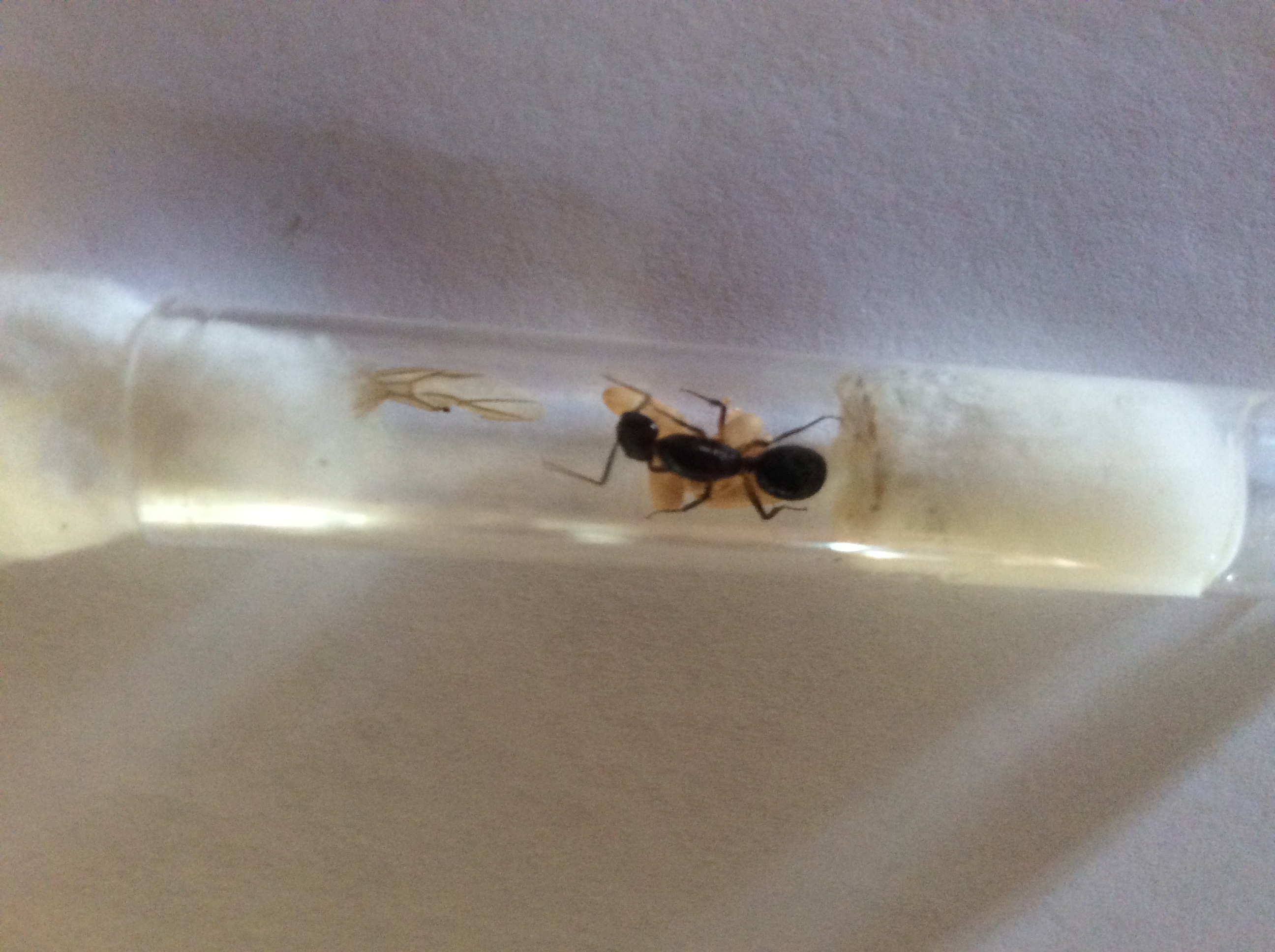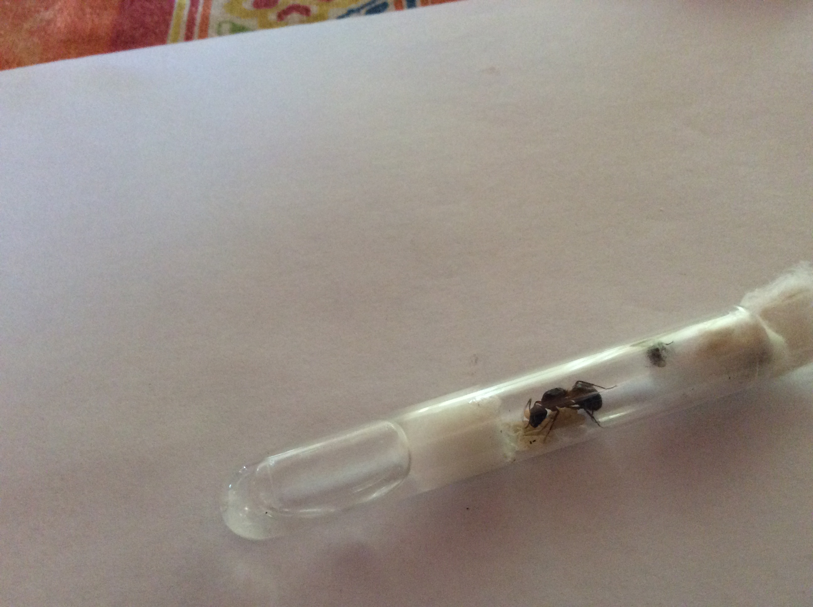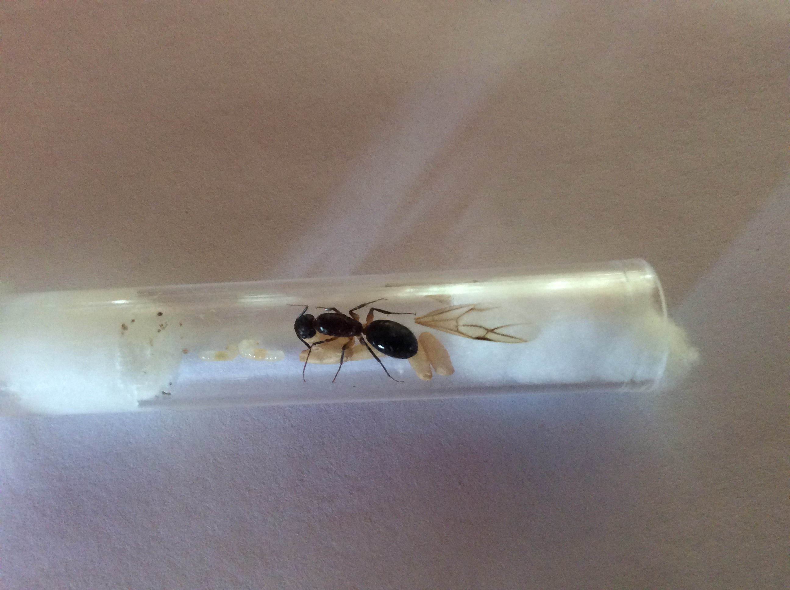 Ecco altre foto della prima regina con prole. Ci sono 2 operaie in più rispetto all'altra volta e oggi ricevono la loro prima goccia di miele. Spero siano leggermente migliori queste foto anche se fatte con un cell da battaglia.