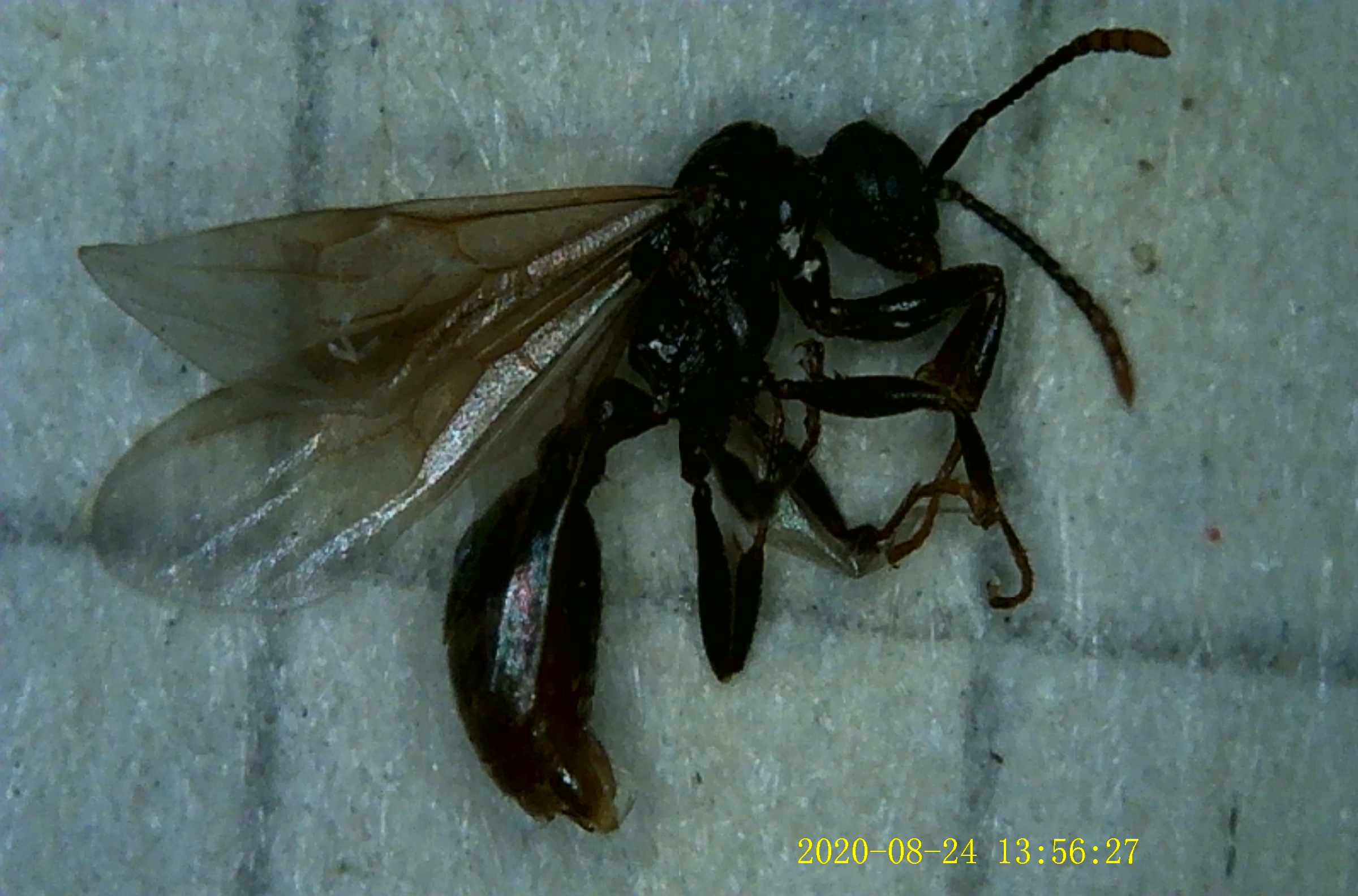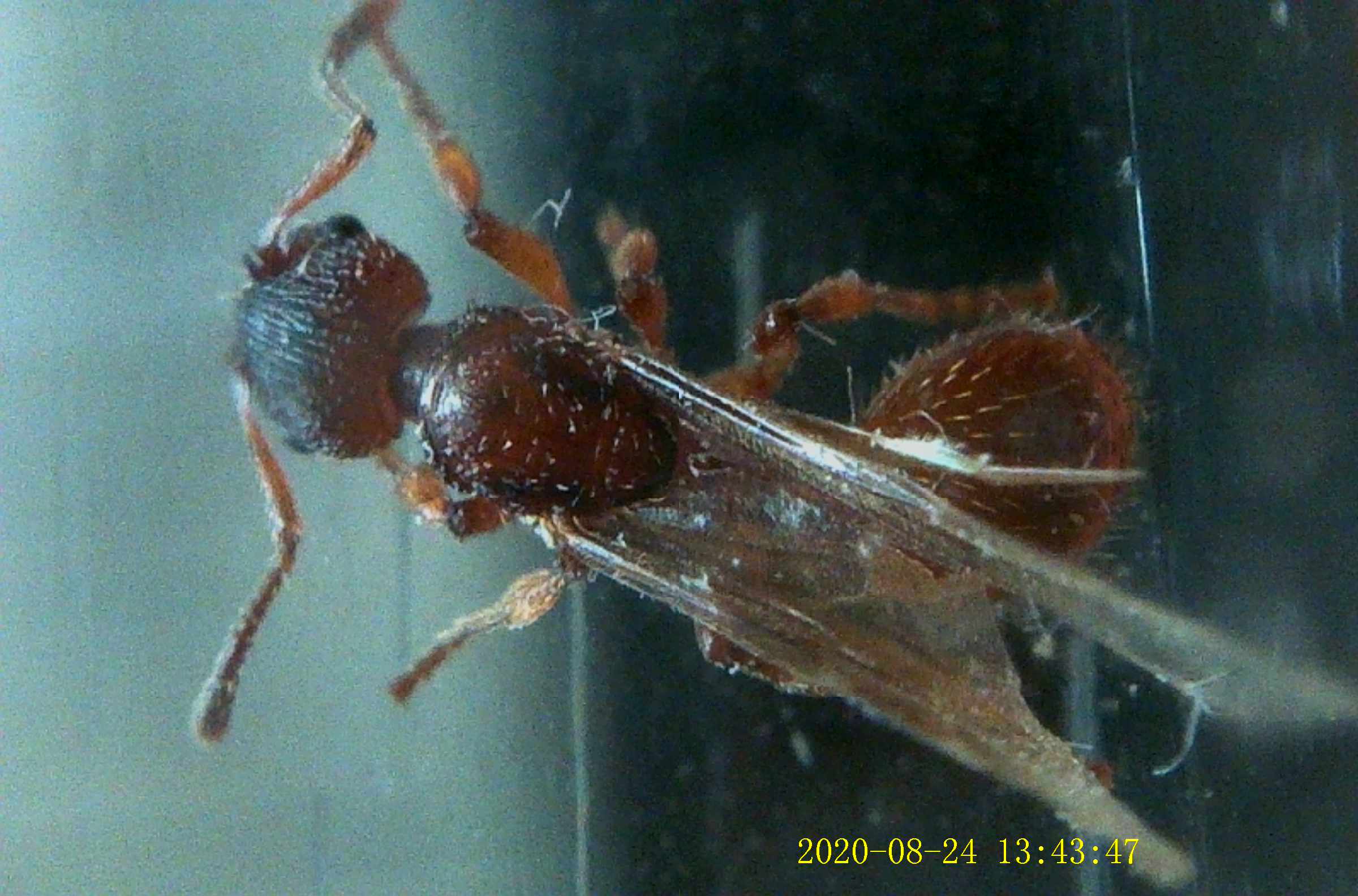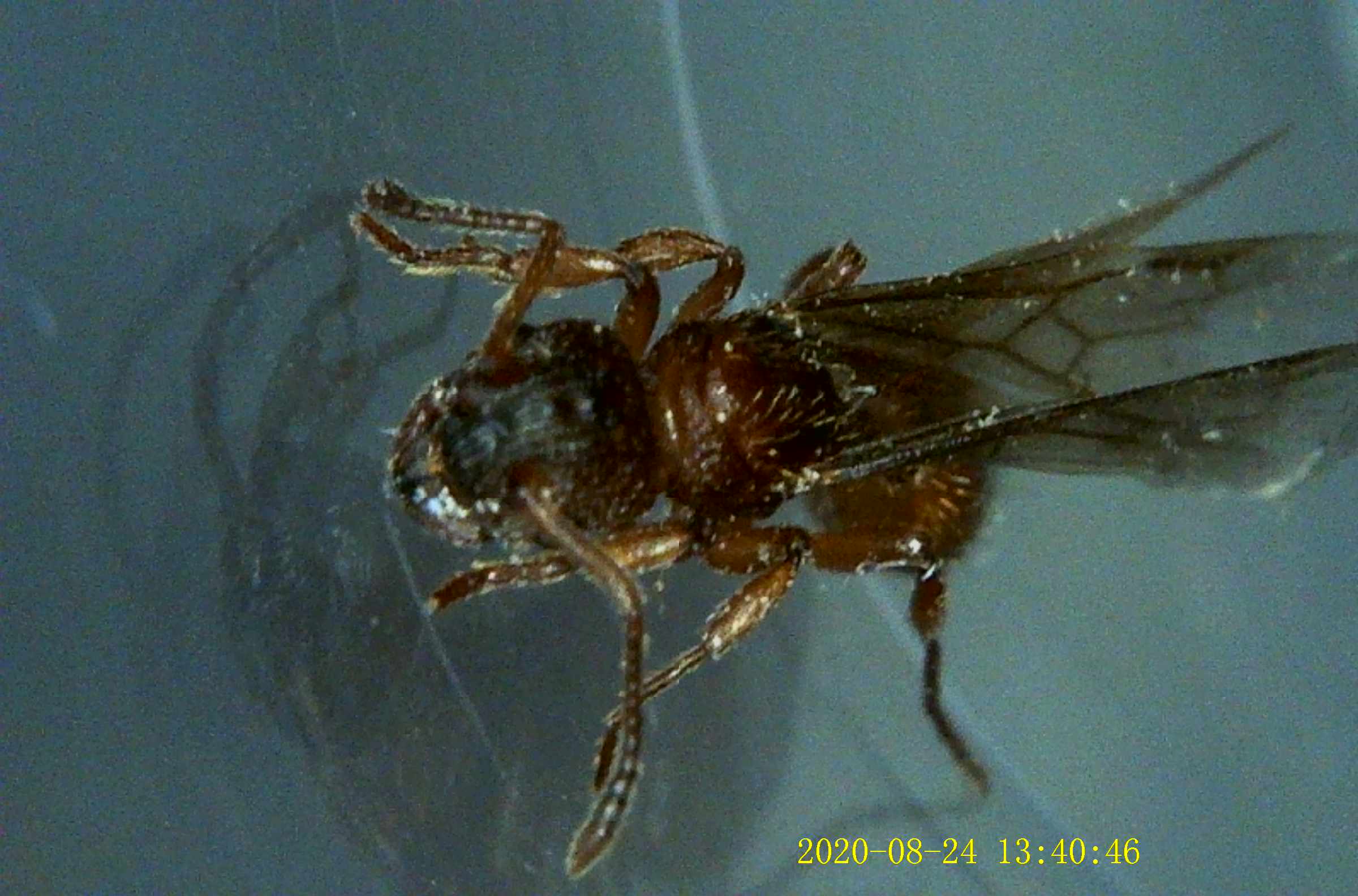 Mi sembra della stessa specie della regina, per cui lo ho temporaneamente posto in provetta con lei sperando in una "rinascita" e magari se necessaria fecondazione miracolosa. Misura 4 mm.