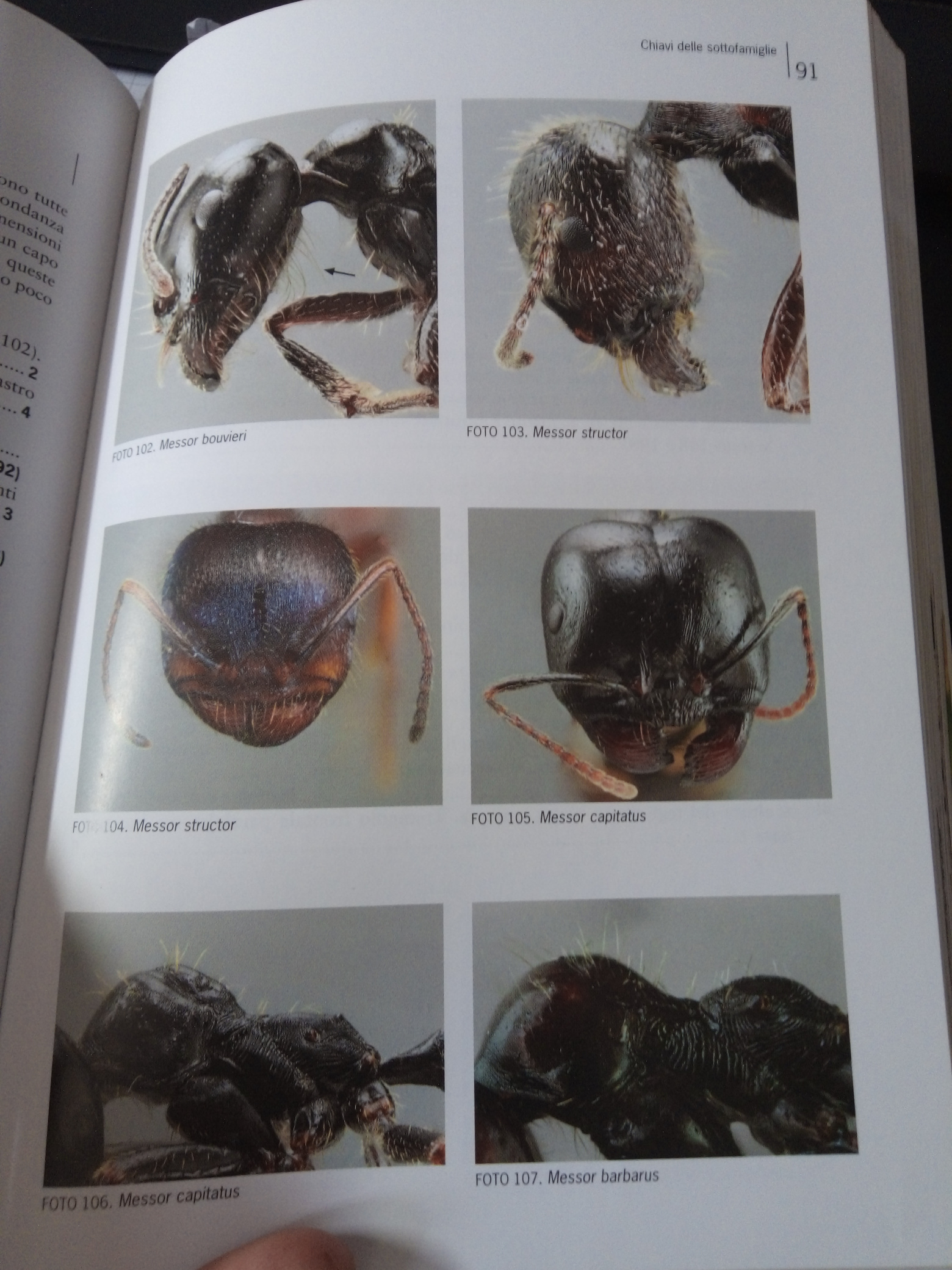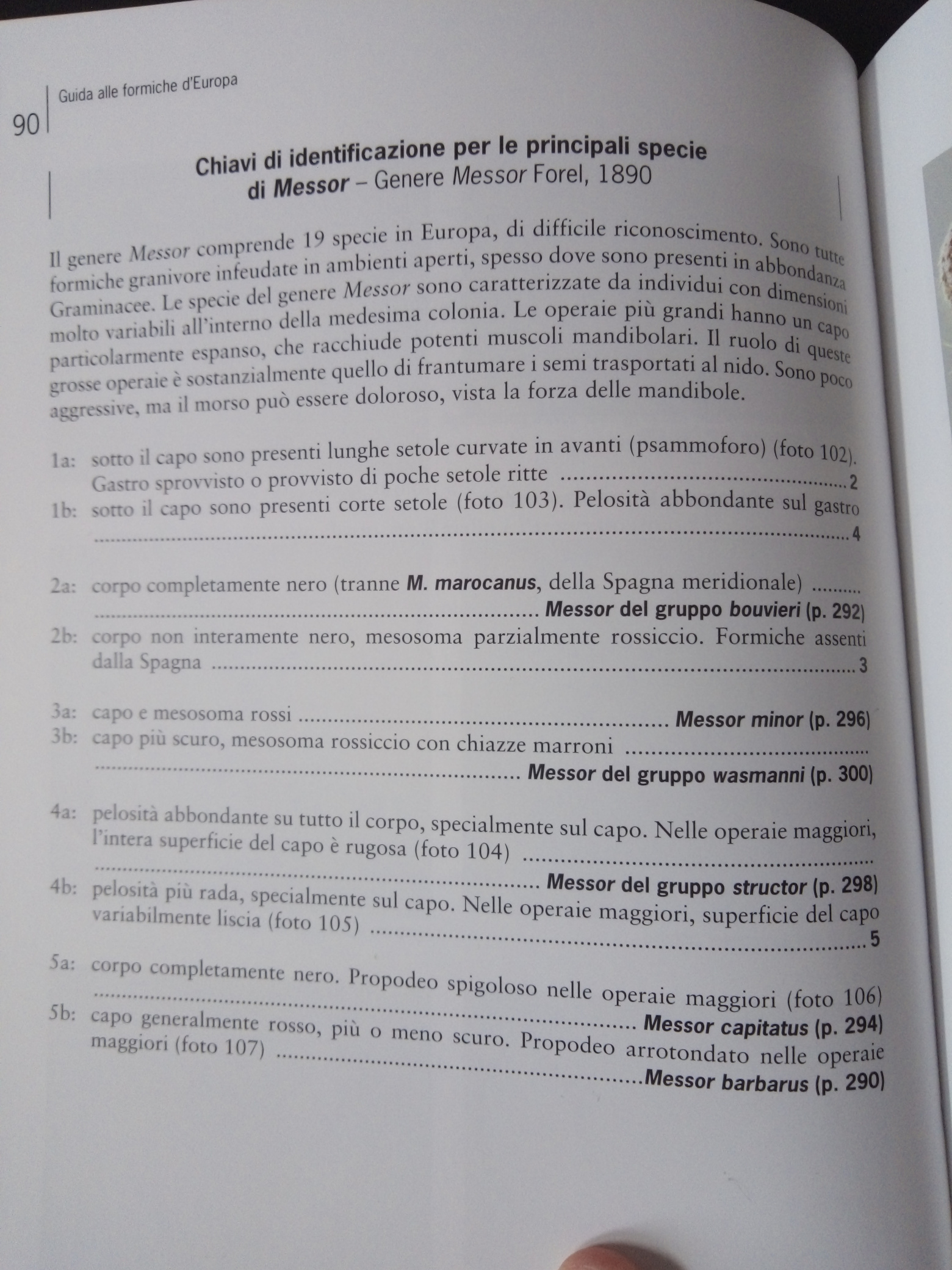 - circa 50 dedicate alle chiavi dicotomiche di riconoscimento DELLE OPERAIE. Le chiavi mi sembrano fatte abbastanza bene, e permettono in teoria di identificare, per ogni esemplare, la specie o almeno il sottogenere e gruppo di appartenenza. Per essere applicate sistematicamente le chiavi hanno comunque bisogno di foto al microscopio, senza microscopio comunque permettono una identificazione di massima più che soddisfacente. Al termine dell'identificazione la chiave ti rimanda alle schede individuali corrispondenti.