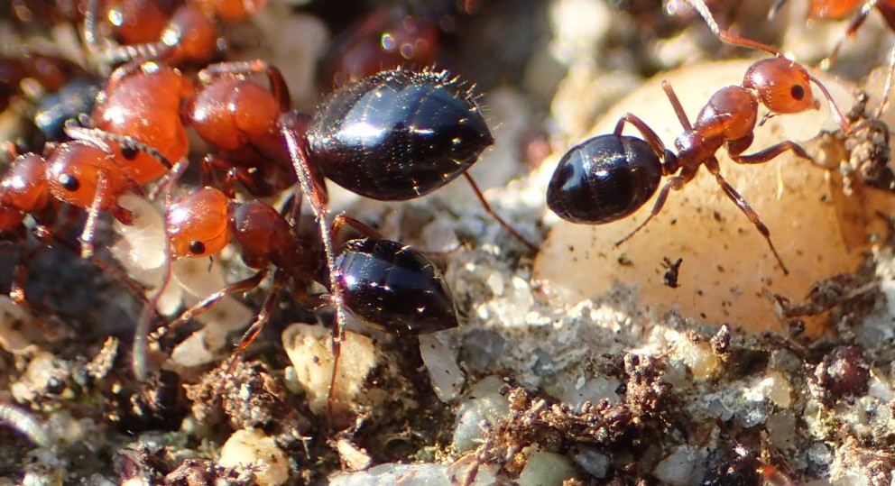 Oggi, Castelleone (CR), sotto una pietra in una vecchia discarica ormai "naturalizzata"; mi sembrano delle rizzaculo (un pochino più panciute del solito, non vedo neanche le spine che di solito hanno sul propodeo...) ma quelle che ho a casa, a differenza di queste, hanno il torace nero e mi sembrano tutte delle stesse dimensioni (qui, regina a parte, ci sono formiche molto più grandi di altre).
