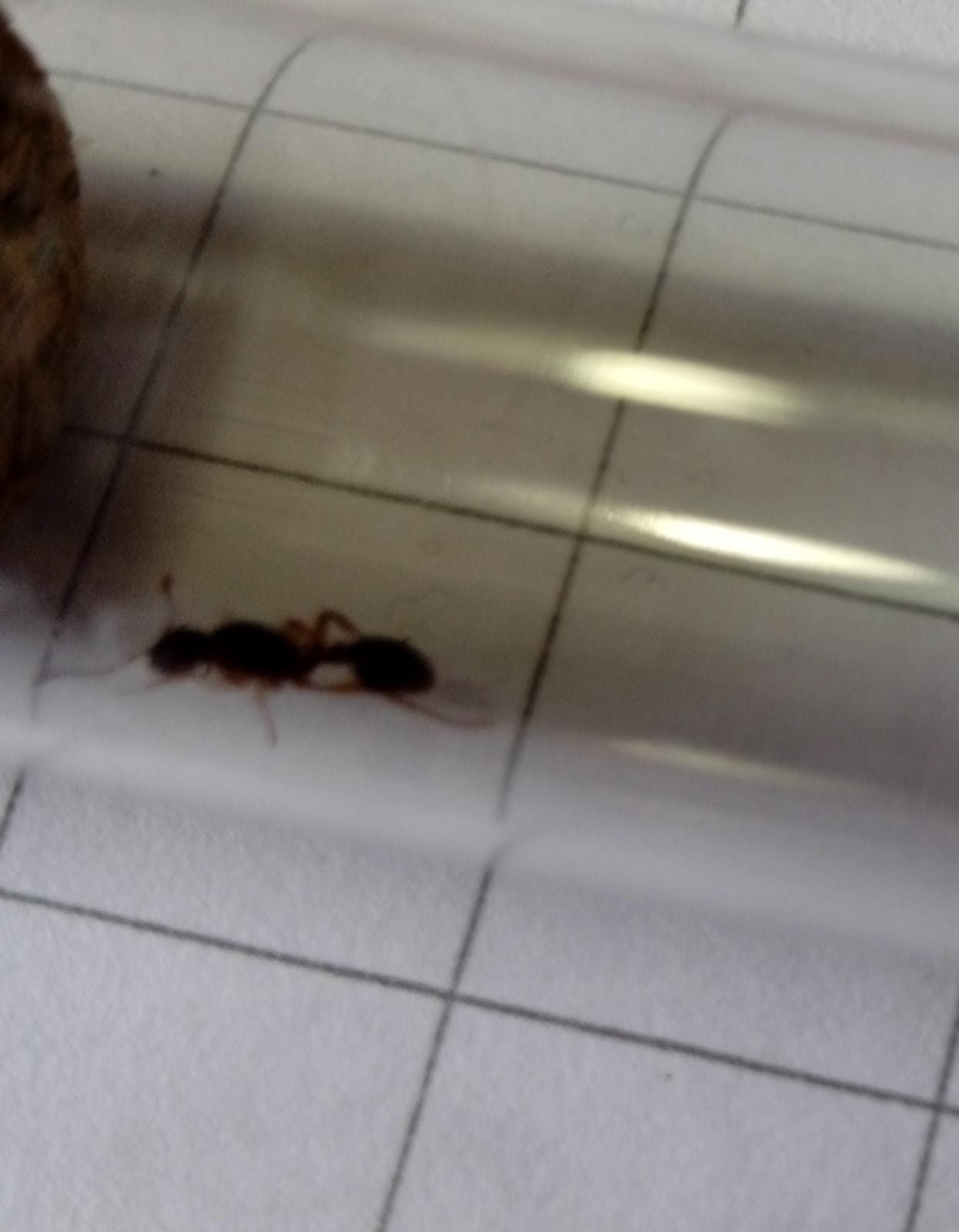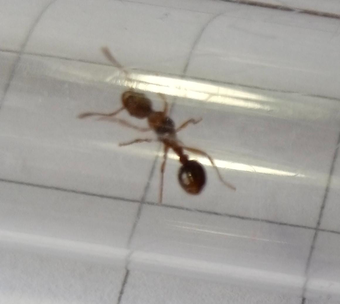 Sospetto che si tratti di una Myrmica rubra, ho letto che sono a fondazione semi-claustrale, dovrei collegare una "mini arena" in cui darle un moscerino ogni tanto?