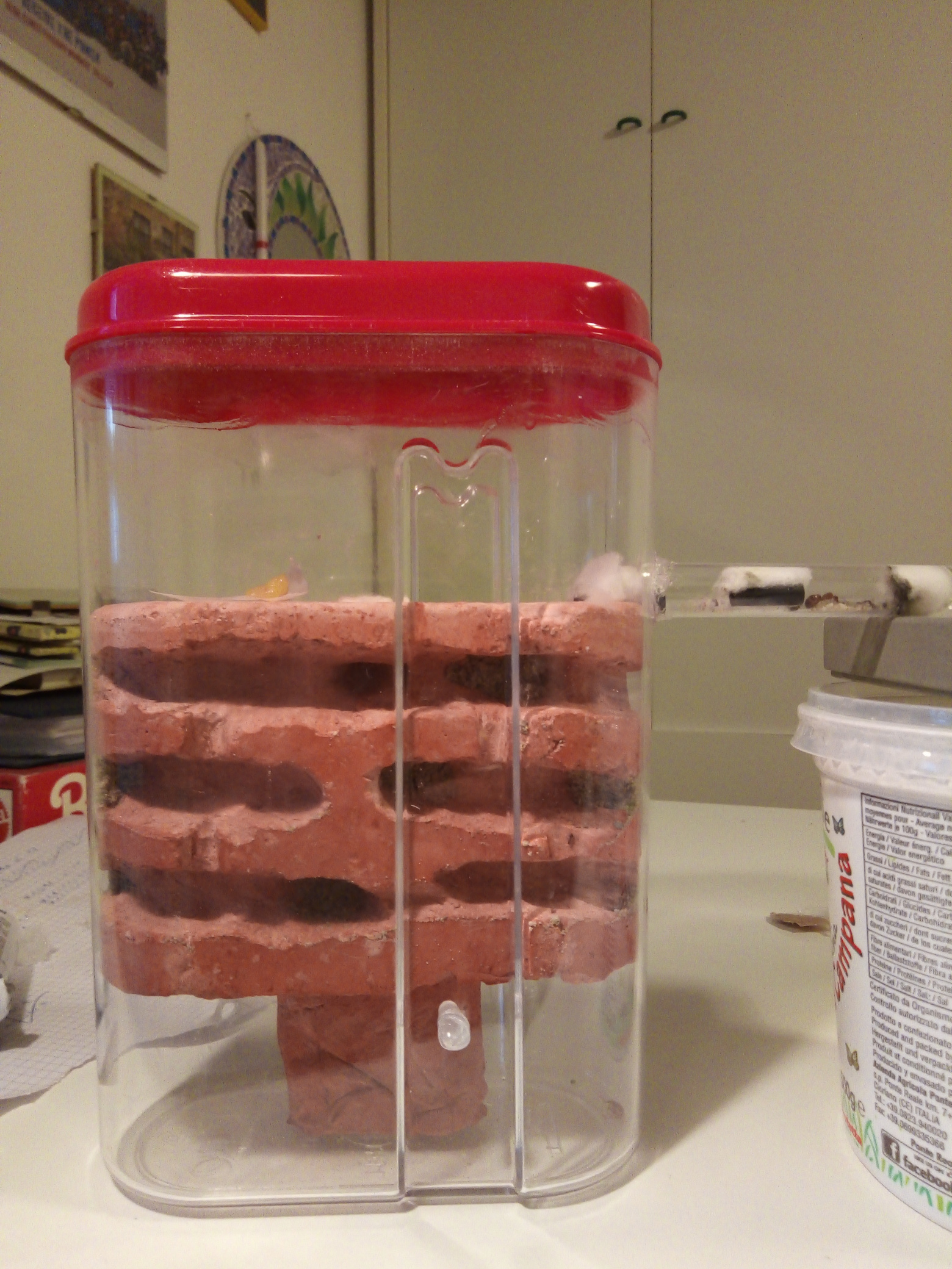 Arrivato ad avere le operaie che mordevano il cotone per uscire, ho pensato di usare la parte di sopra come arena, dopo aver bloccato l'entrata con del cotone, anche per fare uno "stress test al progetto".