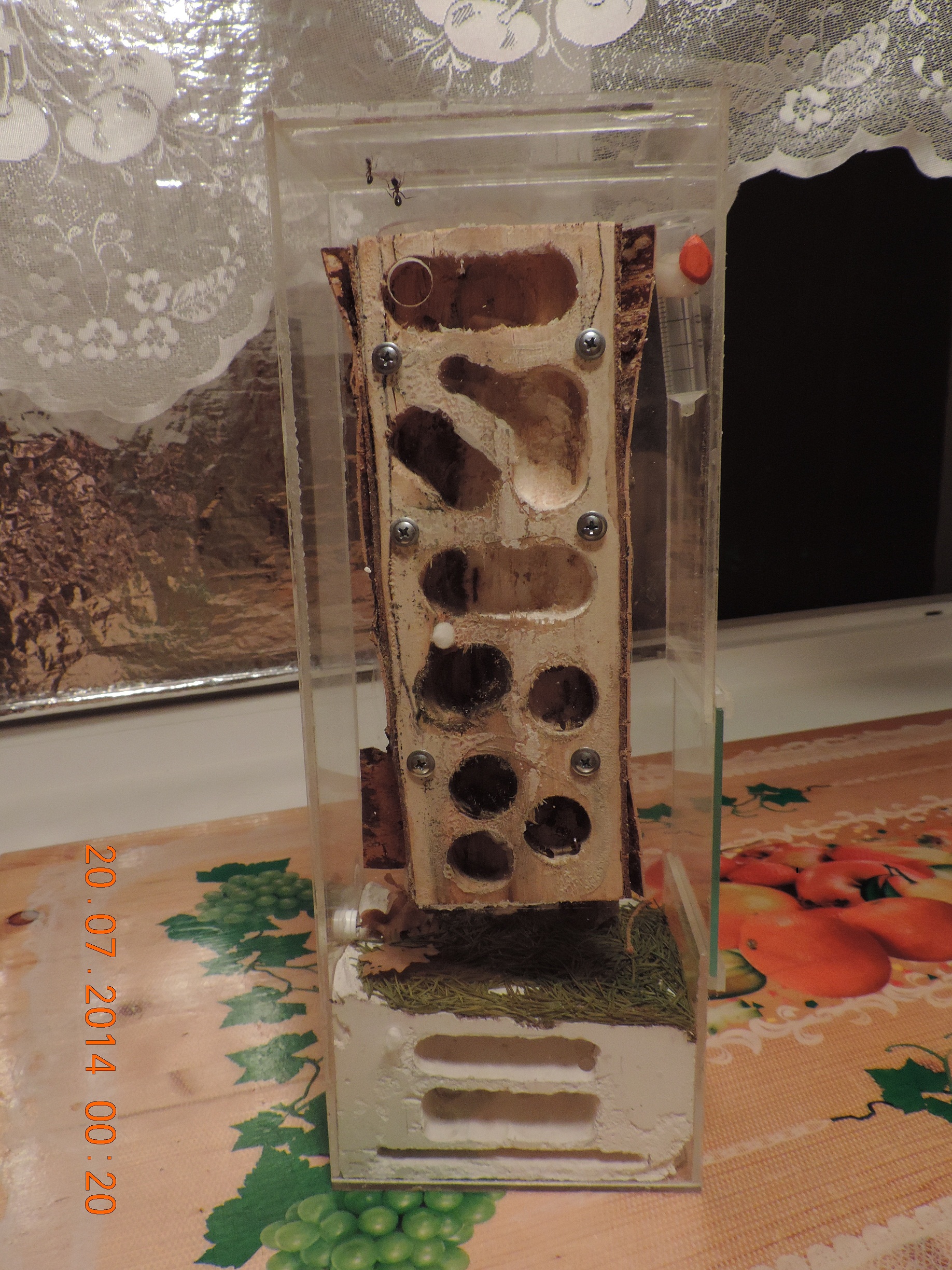 A me sembra un normalissimo nido in gesso (che lui non umidifica neanche più perché tutta la colonia ormai occupa solo il legno) all'interno di una teca di vetro con un ciocco avvitato ad una parete e due rametti messi semplicemente accostati come passaggio. Niente poggia su nient'altro e nulla riceve acqua tranne quel beverino. O.o