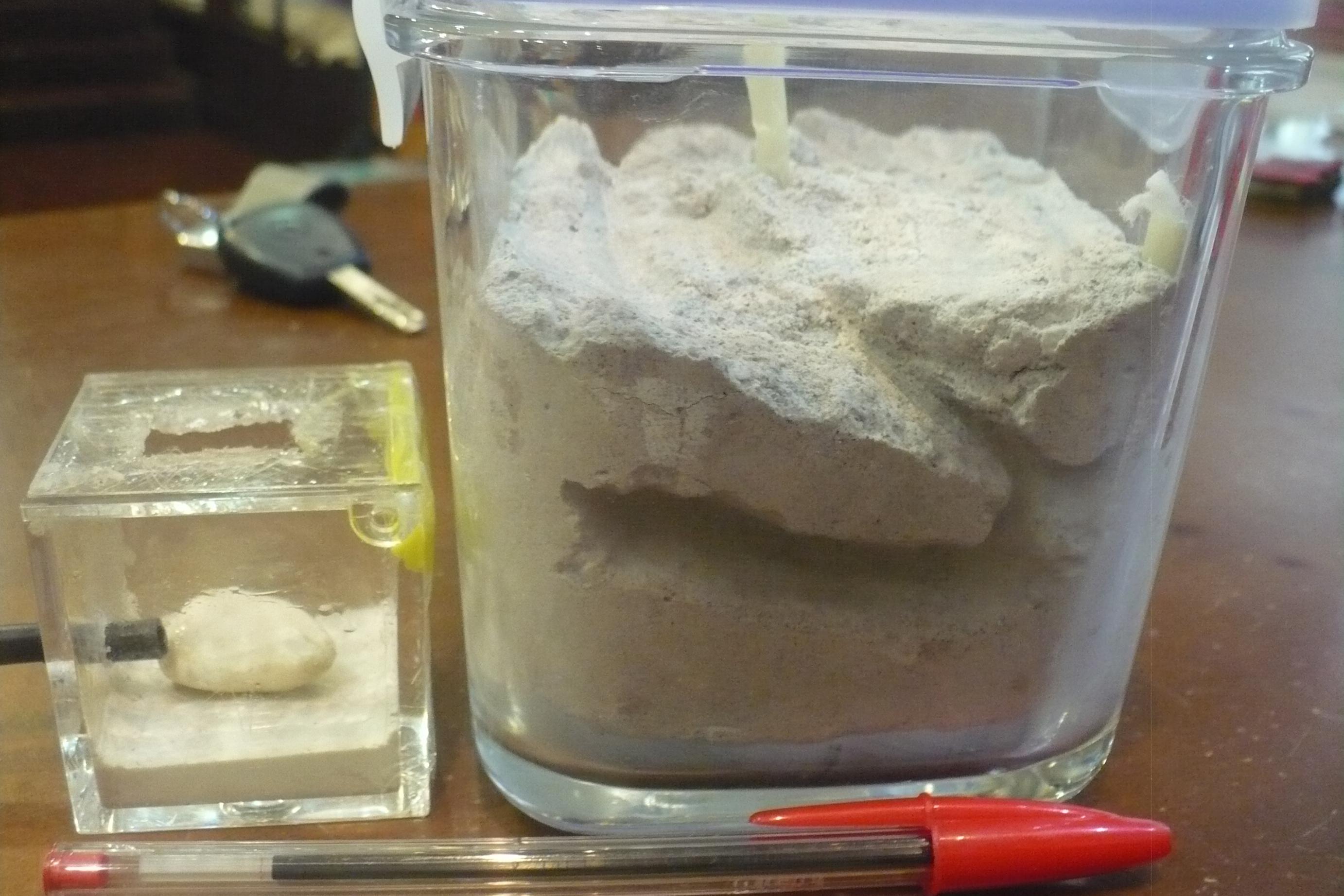 Quindi una provetta in arena non basta; il formicaio in gesso può essere umidificato facilmente attraverso un piedino creato dalla colata di gesso (metti un fondo di polistirolo o materiale da forma e crei uno spazio al centro cosicché si crei un pezzo e basta) e forare il fondo per poterlo riempire a date che ti sembrano migliori.