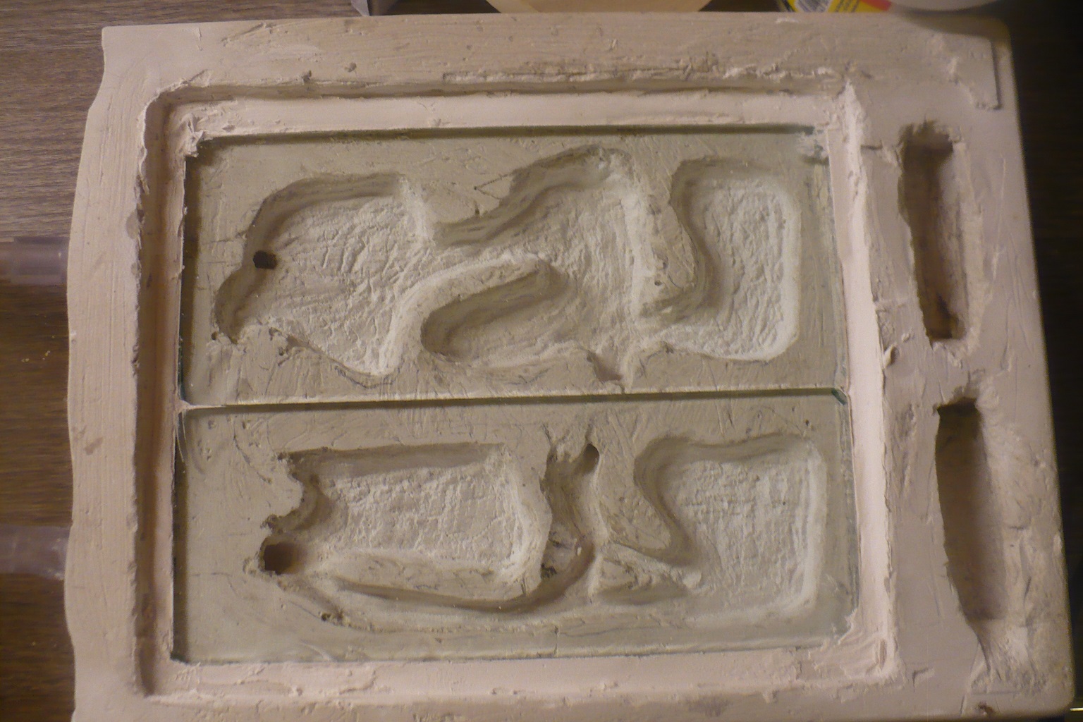 Nel frattempo sono arrivato alla conclusione che questo primo formicaio che stavo facendo non andava proprio bene, troppi difetti. Allora in questo periodo ho preparato quest'altro, e mi sembra meglio. Mi è scappato un pò troppo gesso lo sò, quindi sembra grande, in realtà è piccolino,misura 20 x 16 e poi se notate ho diviso il vetro a metà così posso aprire la galleria comunicante.All'inzio quindi occuperanno solo quello con due stanze(10x8), successivamente tutto quanto(20x16). Spero di aver reso l'idea.