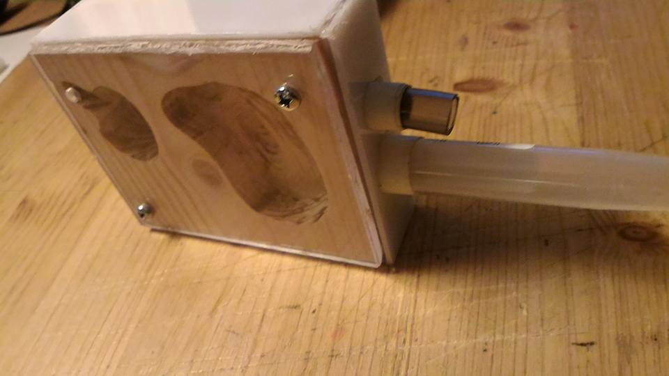 Quest'ultimo l'ho rivestito su tutti i lati con fogli da 2mm di plastica bianca. Attaccati abbondantemente con la pistola termica. Come si può vedere ha un serbatoio, di circa 2 cm cubi, e una piccola zona, profonda circa 1cm, dove dovrebbe stare la regina. Gli ho fatto anche due fori che consentono di inserirci una provetta per cambiare l'acqua e un altro foro per il tubo (diametro interno 8mm), dal quale potrò dargli da mangiare e in futuro far traslocare la (si spera) colonia. Se può aiutarvi a capire le proporzioni, ho posizionato accanto una moneta da 10 centesimi.