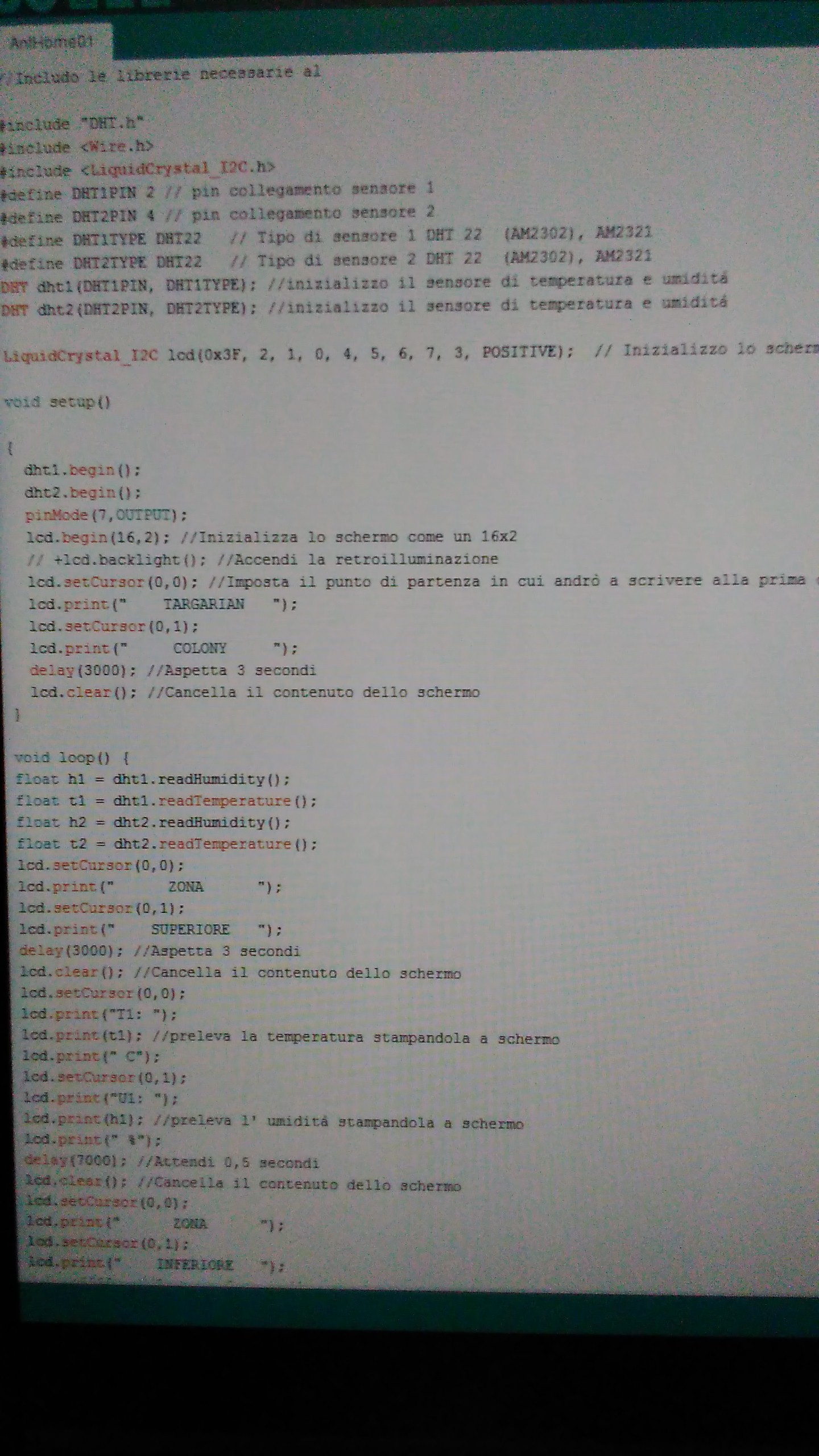 A questo punto ho scritto un semplice programma per Arduino per poter leggere temperatura e umidità in 2 zone diverse, lasciando aperta la possibilità di attivare un relè in caso serva collegare ad esempio un tappetino riscaldante o altro.