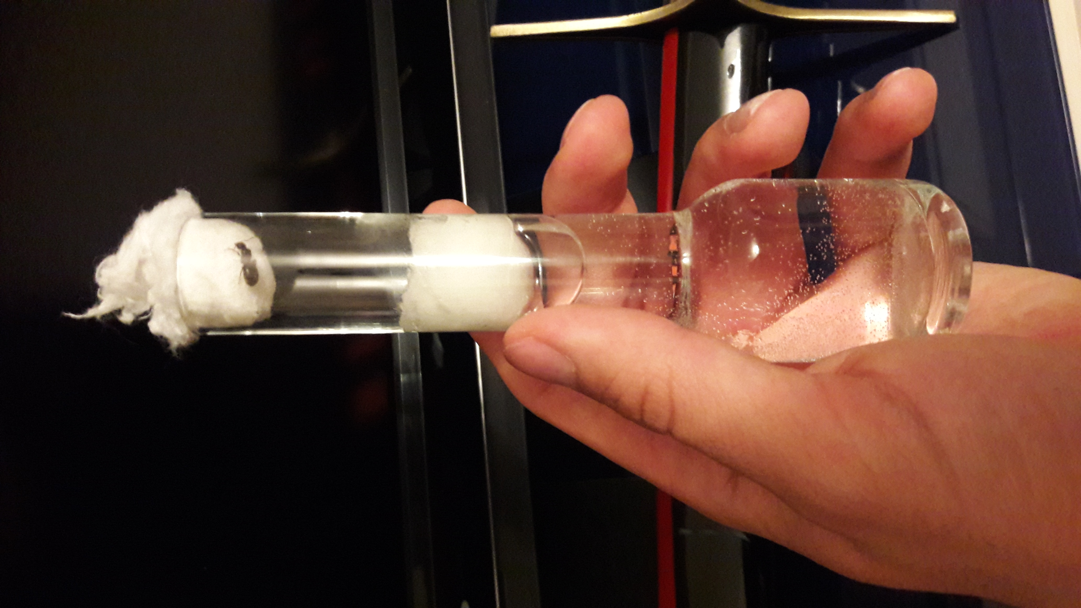 Io di solito tendo ad eliminare le bolle d'aria semplicemente spingendo il cotone oltre il livello dell'acqua, immergendolo, per poi espellere l'acqua presente nella zona dove sosterà la colonia.