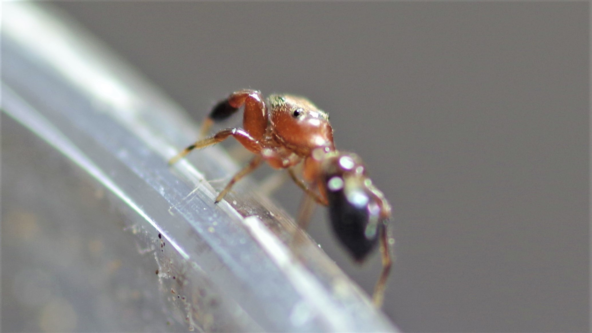 Mi è capitata per caso sott'occhio questa foto scattata in Oklahoma (USA). Ha attirato molto la mia attenzione perché non avevo ancora visto Salticidi mirmecomorfi che imitano chiaramente delle Crematogaster. Direi che il bersaglio del mimetismo sia inequivocabile: quell'opistosoma a cuore lascia pochi dubbi e ci sono varie specie di Crematogaster con questa colorazione da quelle parti. La C. laeviuscula per esempio è comunissima lì.