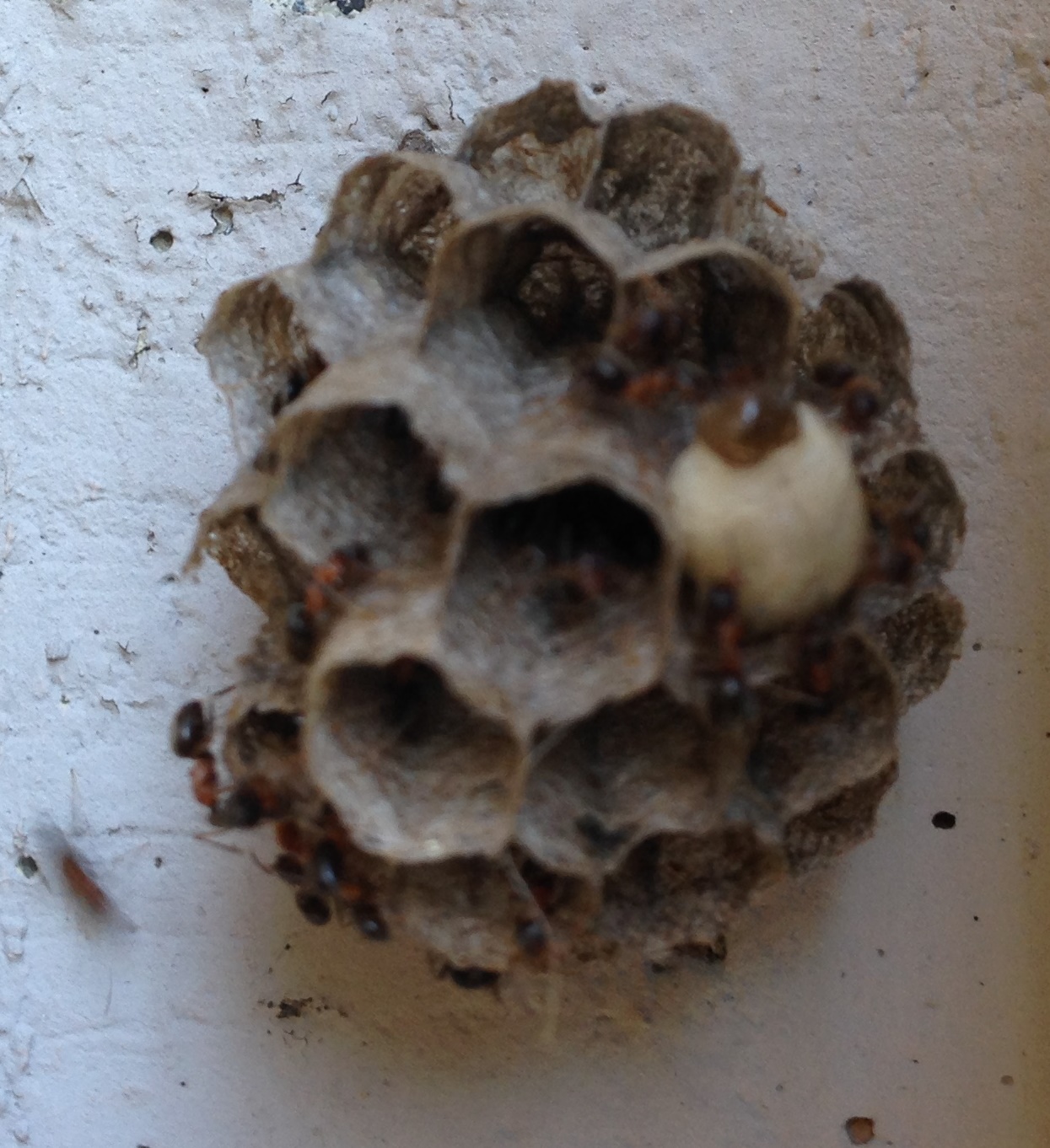 Premessa, vivo a ridosso delle campagne e spesso arrivano le vespe a costruire i loro piccoli nidi. Con un bimbo di due anni che scorrazza per il giardino preferisco prevenire, in questo caso avevo semplicemente spruzzato il nido con l'insetticida per afidi che uso sulle rose. Oggi vado per eliminare il nido e trovo una cosa che non avevo mai visto: le formiche che cercano di estrarre una larva dalla sua cella. Non riesco a capire se la larva è viva o no, ma suppongo sia morta. La cosa strana è che sembra che le formiche la spostano da una cella all'altra invece di portarla nel nido. Le prime foto che vedete le ho scattate col telefono verso le 19 quindi c'era ancora chiaro, le altre più nitide sono fatte con il macro di una reflex (verso le 23) e lì si nota che sono ancora al lavoro e hanno spostato la larva nella cella centrale.