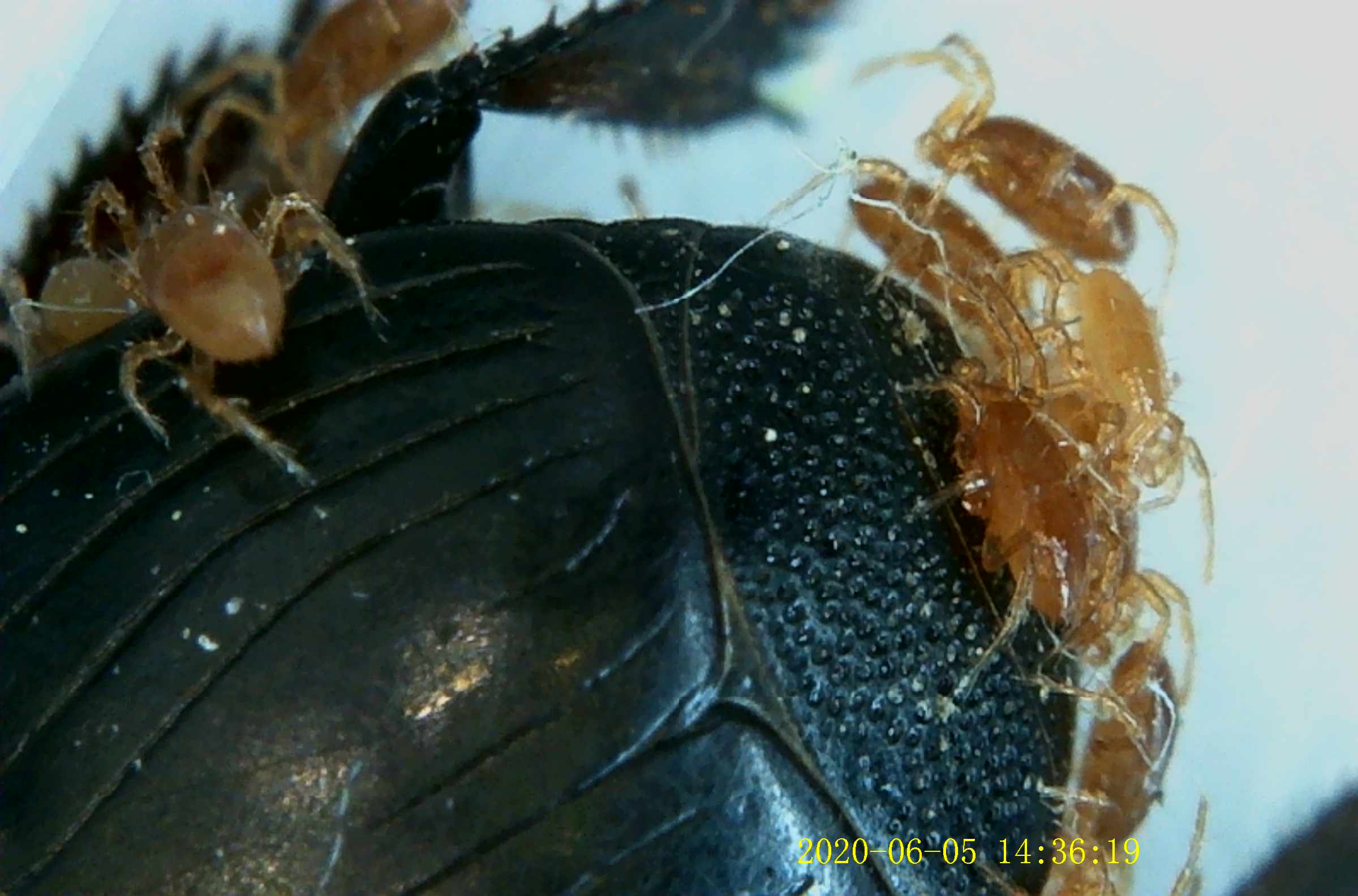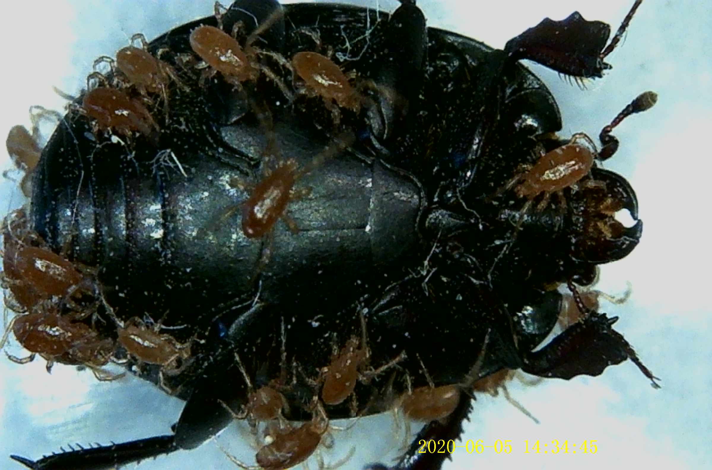 Il coleottero è un Histeridae, forse del genere Margarinotus, forse Hister (sono coleotteri abbastanza difficili da identificare e spesso è necessaria l'estrazione dei genitali maschili per stabilire correttamente la specie). Gli acari sono commensali: questo Histeridae è sicuramente saprofilo, forse necrofilo, forse coprofilo, e si nutre dei vari artropodi necrofagi/coprofagi/saprofagi. Sono predatori estremamente efficaci, a dispetto delle loro piccole dimensioni, e quando si presentano decimano le popolazioni di ditteri. Gli acari servono sia per ridurre notevolmente il numero di acari parassiti sia per infastidire vari competitori biologici. è cosa comune in molti necrofagi e coprofagi anche, come nel genere Nicrophorus o in vari Aphodiini.