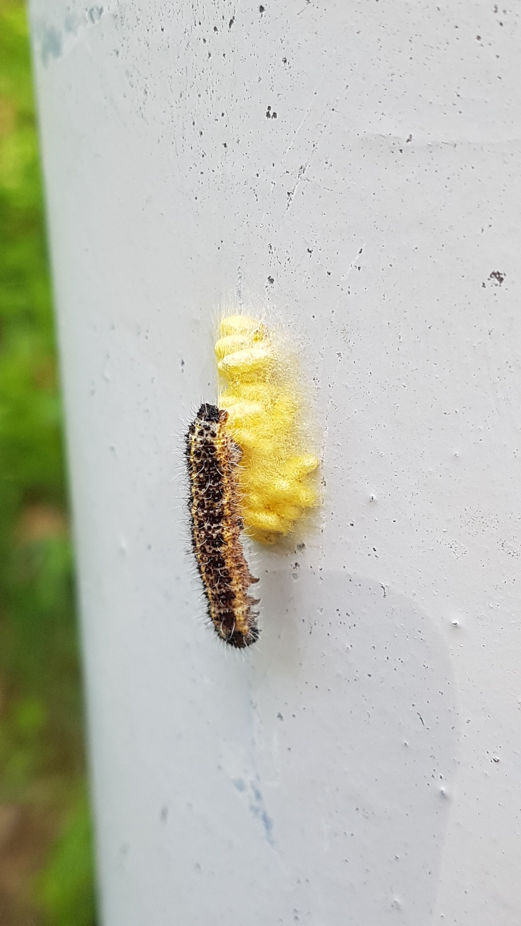 I pallini gialli sono le larve di un imenottero che si stanno imbozzolando: sono nate da uova deposte all'interno del corpo del bruco da una vespa parassitoide, e si sono nutrite degli organi interni del malcapitato lepidottero fino a che sono cresciute a sufficienza per fare breccia attraverso il bruco e imbozzolarsi (nella seconda immagine si vede una larva ancora intenta ad uscire allo scoperto).