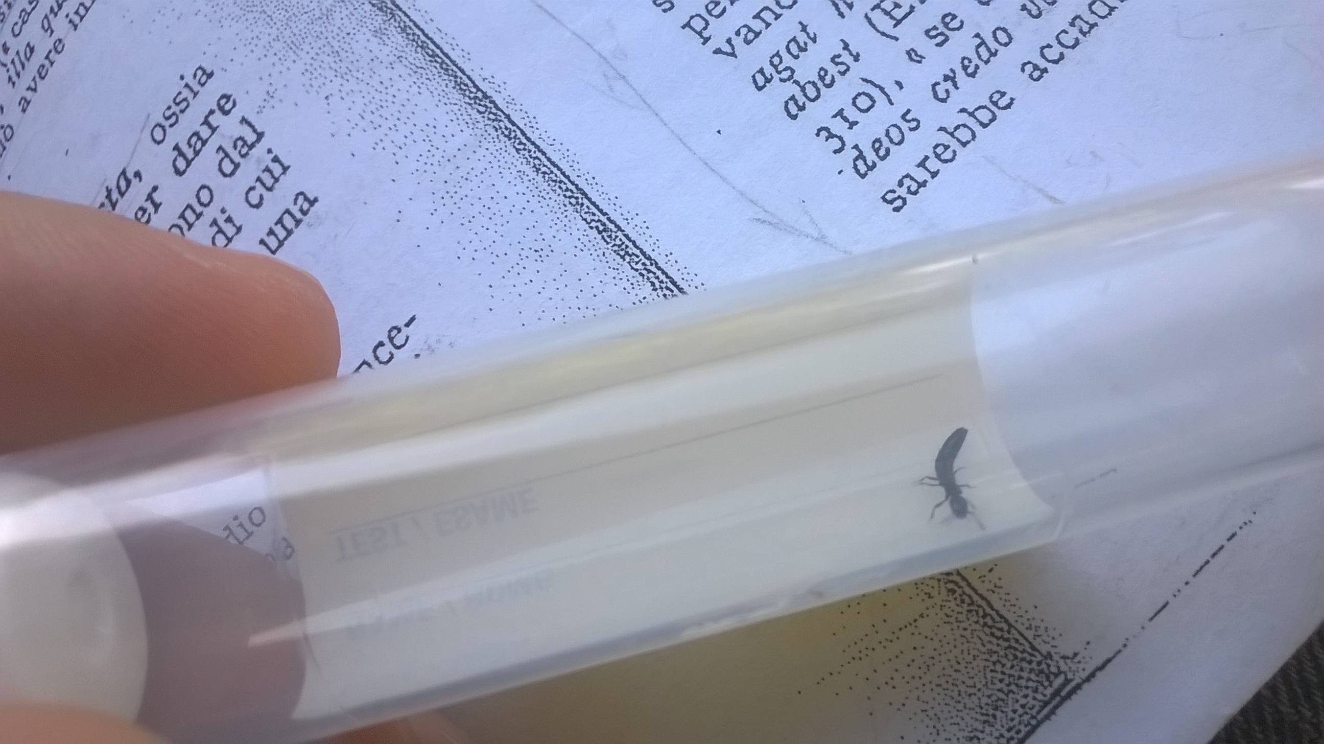 Comunque visto che insisti tanto, ecco la pessima foto del mio amico milanista..stesso atteggiamento e portamento dell'altro, ma supera il cm..antenne più lunghe (in proporzione), zampe chiare con giunture nere(giustamente ha le ginocchiere) testa nera con belle mandibole, torace rosso acceso con primo paio di zampe, un segmento nero che mi sembra completamente liscio, una sezione rossa che invece ha delle linee e parte finale di nuovo nera e senza linee, con coda vagamente biforcuta, insomma non cerci..nella provetta ci sono dei frammentini di terra che aggredisce con molta energia (non erano voluti, e del resto presto riporterò il mio amico nel vaso in cui tutto ha avuto inizio)