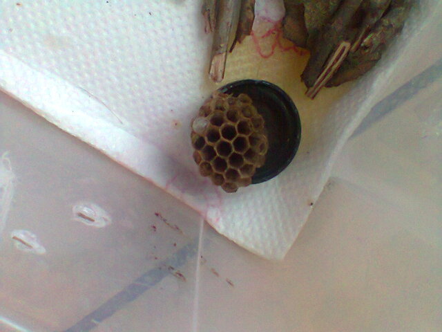 Oggi ho trovato un piccolo nido di Polistes: conta 6 cellette ed ha già 1 larva che si sta impupando! La regina è molto calma e si fa maneggiare volentieri (da quando le ho somministrato una goccina di miele sopra uno stuzzicadenti