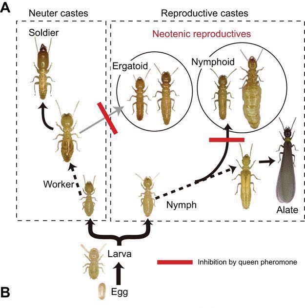 Chiez, nelle Reticulitermes gli operai sono sia maschi che femmine, essi daranno quindi (giustamente) origine a neotenici sia maschi che femmine, che si accoppieranno tra loro e creeranno una colonia vera e propria. Come nota finale, c'è da dire che alcune termiti possono riprodursi sia sessualmente che asessualmente, come Glyptotermes nakajimai.